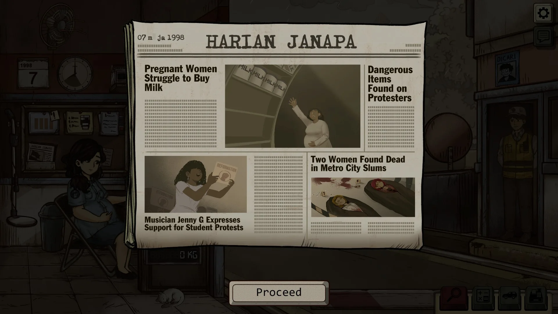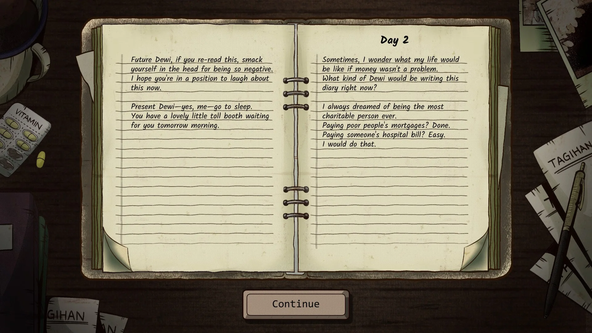 Na konci každého dňa ešte Dewi zhrnie svoje dojmy vo svojom denníku, ktorý môžete maximálne nadekorovať a obohatiť o vlastné myšlienky, ak k tomu chcete niečo doplniť. Úplne však nerozumiem tomu, aký má význam dopisovať naše myšlienky ako hráča k celej situácii. Čo by sme vlastne k tomu mohli pridať? Vie si vôbec niekto predstaviť, čo ešte navyše môže prežívať žena tesne pred pôrodom v krajine, kde sa pravidlá menia každý deň? Verím, že väčšina z nás asi nie. Hra má v sebe dostatok silných a zaujímavých prvkov, ktoré však pre nulovú interakciu nikdy nedokážu vyznieť tak silno, ako by mohli. Či už ide o zvýšenie nájomného, akcie vášho manžela alebo snahu pomôcť kamarátke utiecť z krajiny. Vo výsledku tak, bohužiaľ, pôsobia tieto scény menej zaujímavo, než by reálne mali.