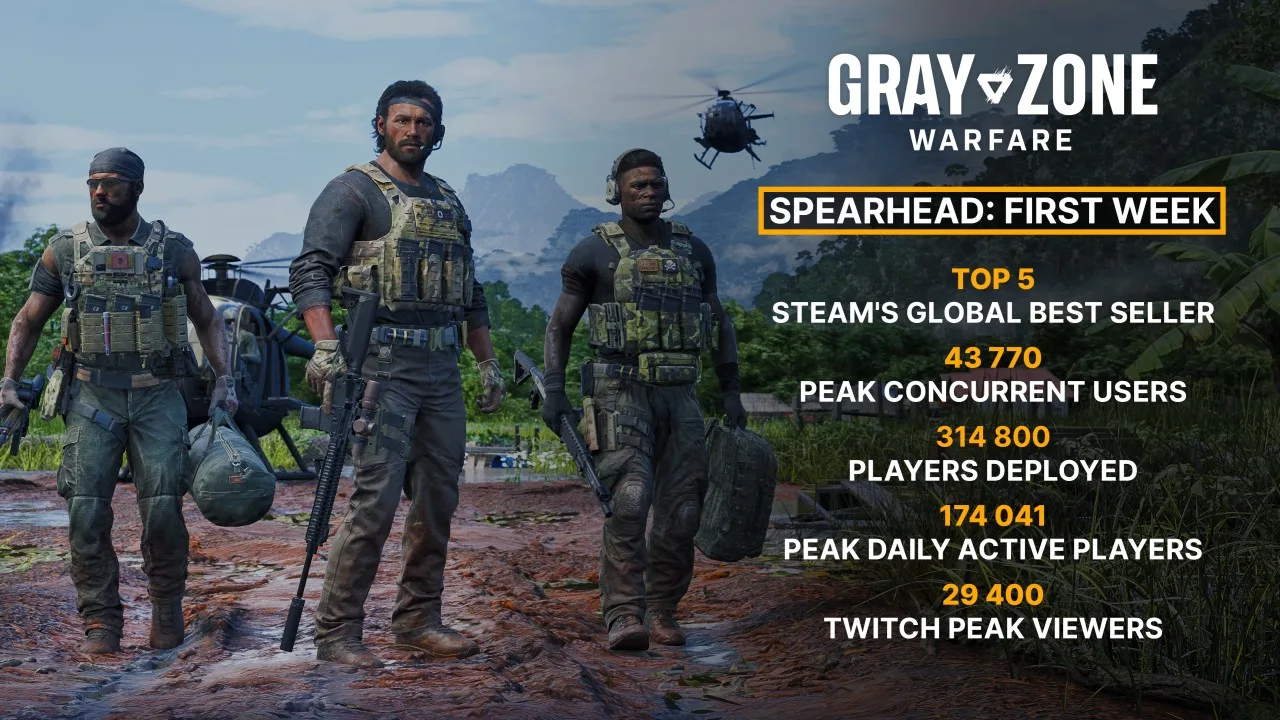 Od vydání aktualizace Spearhead zaznamenala hra Gray Zone Warfare výrazný příliv hráčů, kdy dosáhla maxima 43 770 současně připojených uživatelů a vyšplhala se do TOP 5 nejprodávanějších her na Steamu na celém světě. Od svého vydání přivítala hra více než 314 800 hráčů, přičemž denní maximum aktivních uživatelů dosáhlo 174 041. Zájem komunity se rozšířil i mimo samotnou hru, když sledovanost na Twitchi dosáhla maxima 29 400 současně sledujících diváků.
