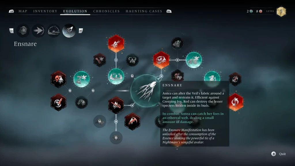 U každého ohniště pak můžeš vylepšovat vše co máš, včetně dovedností. Jejich strom je celkem rozvinutý a má více možných kategorií. Vylepšuješ nejen své schopnosti, ale i ty Anteiny, protože i ona může zasáhnout do soubojů a tím se stávají ještě více zábavné.
