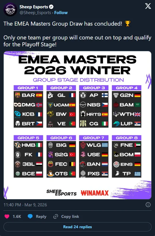 EMEA Masters Winter 2026 se blíží a los skupinové fáze odhalil, že letošní turnaj bude náročnější než kdy dříve. Z 36 týmů bylo 32 rozděleno do osmi skupin po čtyřech, přičemž vítěz každé skupiny si zajistí postup do playoff, zatímco tři zbývající týmy končí svou cestu hned v základní fázi. Přímou kvalifikaci do druhého kola playoff si zajistily týmy Solary, Misa Esports, Verdant a Movistar KOI Fénix díky výsledkům v Champions Round. Zápasy začínají 10. března a turnaj vyvrcholí 21. dubna.