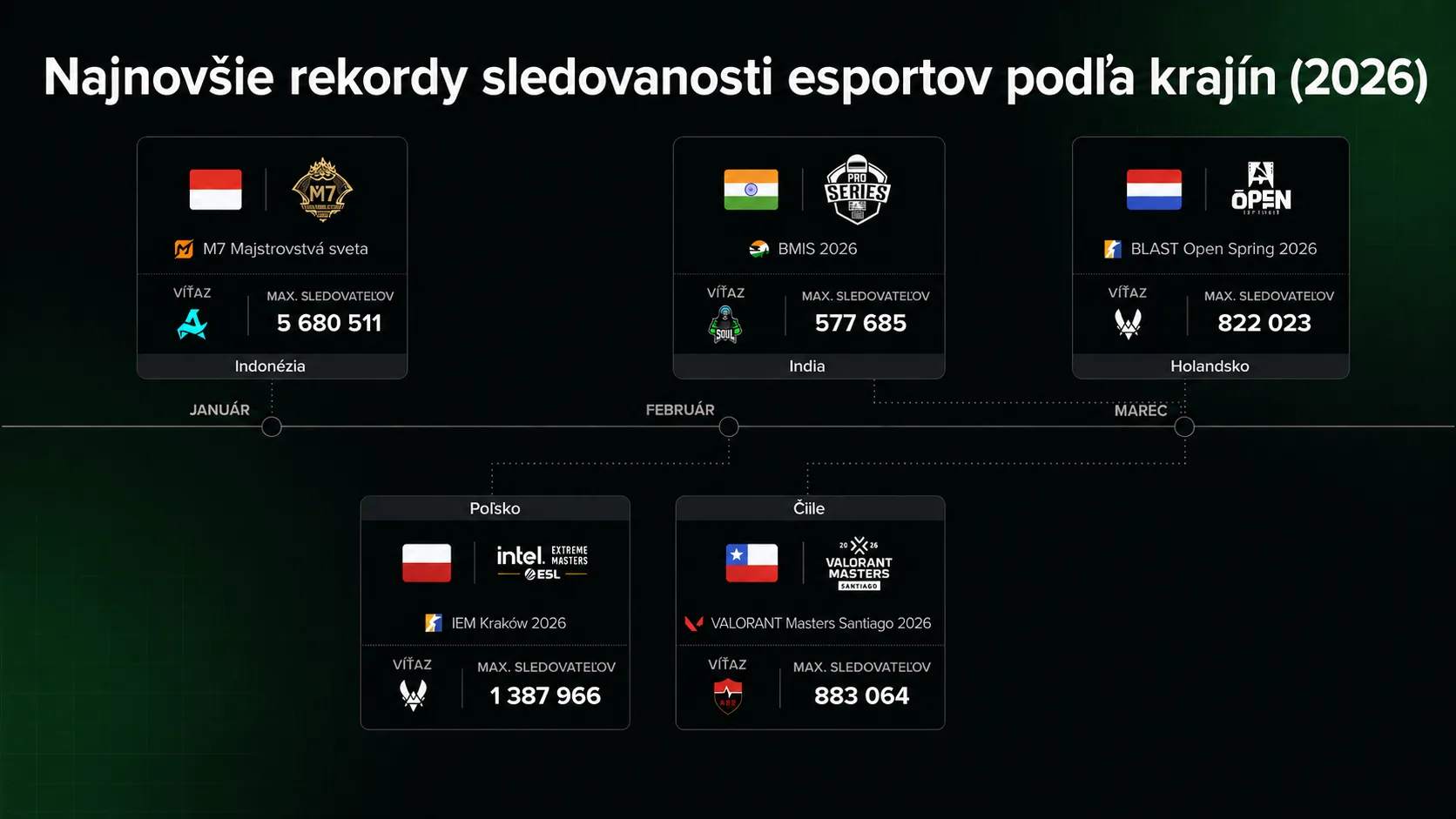 Rozmach esports nie je náhodný. Veľké turnaje sa čoraz viac presúvajú do nových lokalít a oslovujú širšie publikum. Tento trend je možné sledovať aj vďaka nástrojom, ako je globálna mapa od Esports Charts, ktorá mapuje sledovanosť a popularitu jednotlivých hier a podujatí. Najnovšia aktualizácia navyše priniesla časovú os rekordov sledovanosti, vďaka čomu je možné lepšie sledovať vývoj a dynamiku rastu v priebehu času.