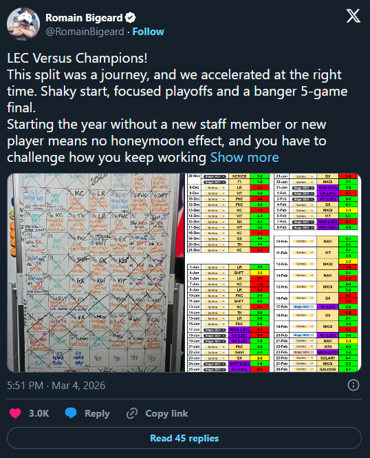 Po triumfu v LEC Versus se G2 Esports rozhodlo odhalit zákulisní stránku své přípravy. Generální manažer Romain Bigeard zveřejnil kompletní výsledky scrim zápasů, které tým odehrál mezi 8. prosincem 2025 a 28. únorem 2026, tedy těsně před finálovým střetem s Karmine Corp. Celková vítěznost G2 v tréninkových zápasech činila 64,37 %, což je sice mírně pod výkonem z letního splitu 2025 (68,1 %), ale stále odpovídá standardům evropského šampiona.