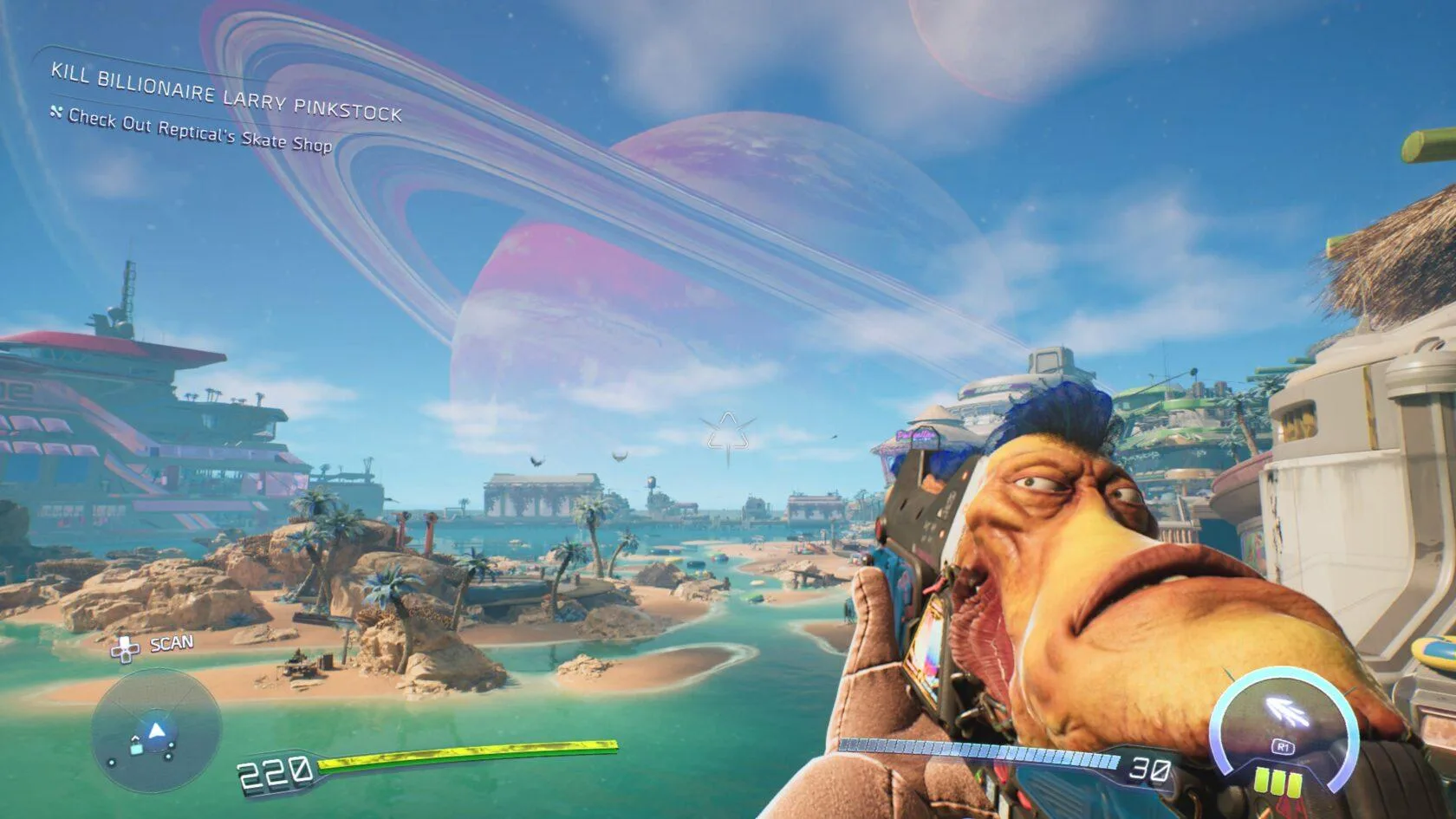 Áno, priznávam, pôvodne som si myslel, že sú planéty veľké výhradne kvôli implementovaniu skateboardu – ešte sa k nemu dostaneme. Po hodine mi však došlo, že sú prešpikované najrôznejšími aktivitami. Tie sa postupne sprístupňujú a rozširujú, čo znamená, že každý jeden návrat je niečím zaujímavý. Odhalíte unikátny dialóg. Pribudne nový plagát hľadaného strážený tímom krvilačných robotov (asi chápete, čo s nimi musíte urobiť). Dokonca, tu a tam predajcovia otvoria obchod a vy si tak viete zakúpiť lepšiu obuv. Tá ma síce striktne vizuálny charakter, avšak ide o peknú pozornosť prehlbujúcu zžitie sa s mlčanlivým vesmírnym kovbojom s absentujúcim charakterovým prekreslením.