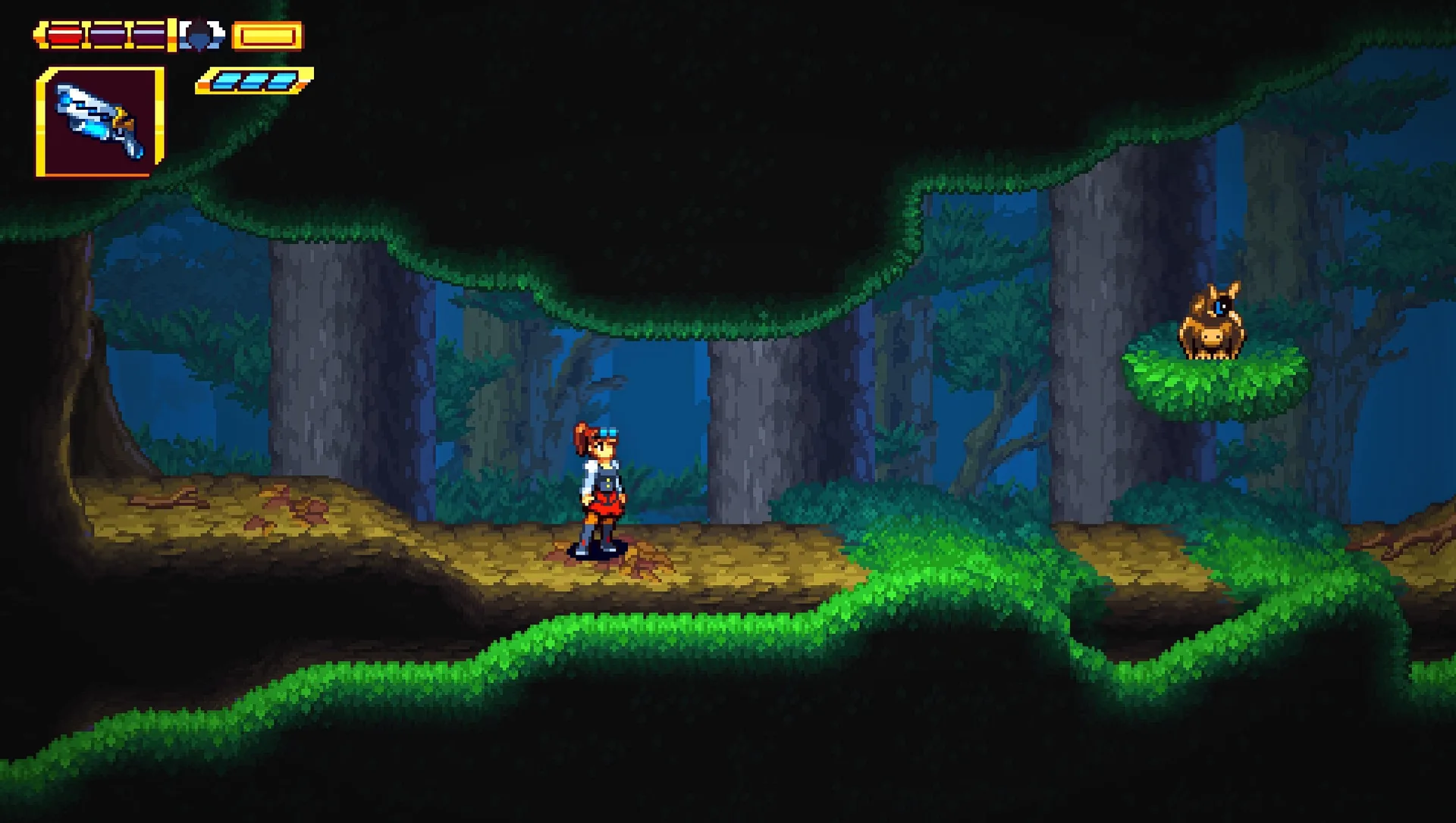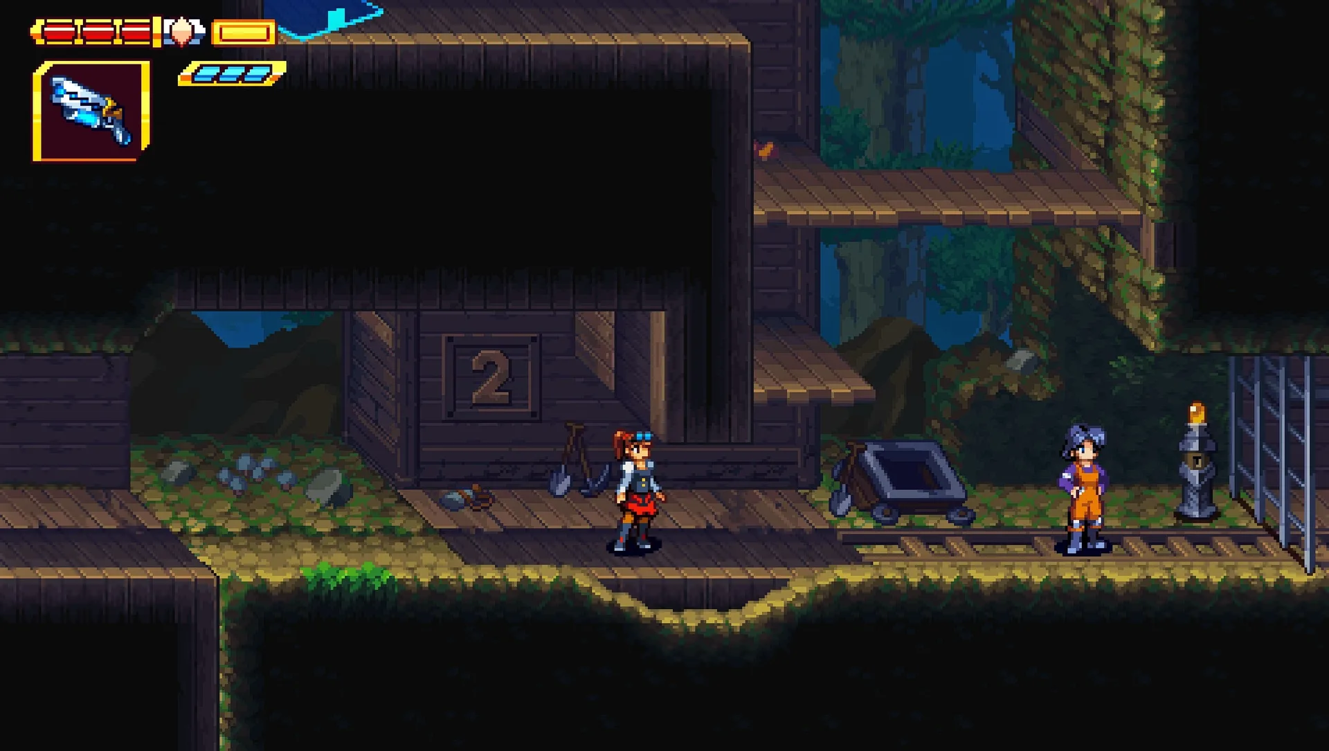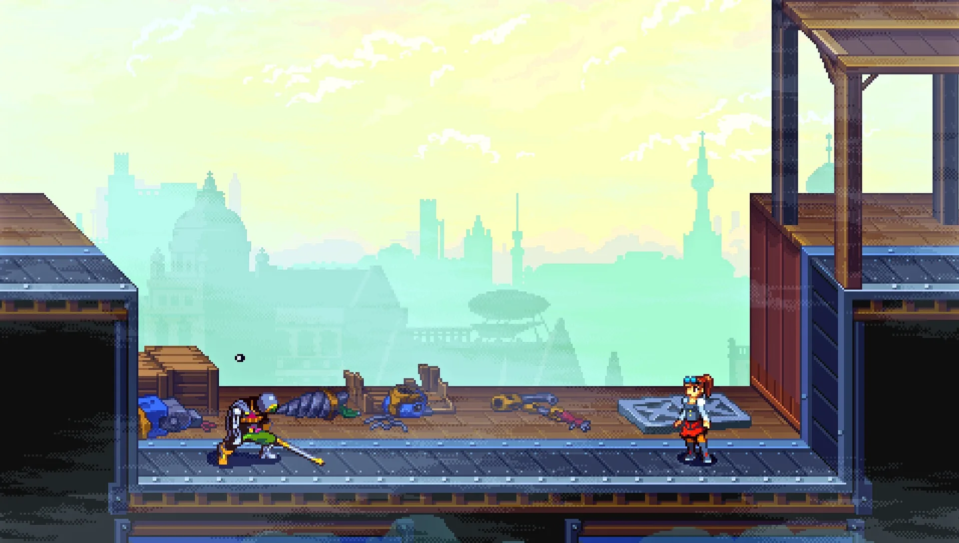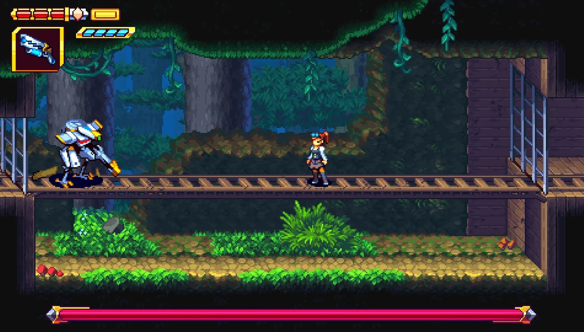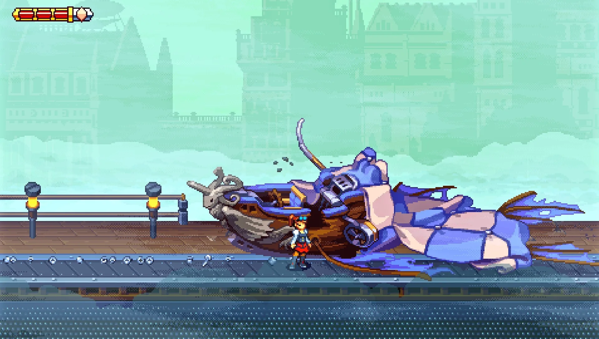 Příběh nás uvádí do role Iris, talentované inženýrky a pilotky vzducholodě, která se po katastrofální havárii ocitá na tajemném ostrově Aspida. První kroky v tomto světě okamžitě prozradí autorovu fascinaci klasikami typu Metal Slug nebo Mega Man. Ručně kreslený pixel art je precizní a prostředí ostrova, od zrezivělých industriálních komplexů až po podivné biomechanické lesy, působí díky drobným animacím neuvěřitelně živě. Iris není jen bezejmenná postava, její inženýrský původ se propisuje do celého herního zážitku. Každá změna vybavení, ať už jde o funkční brnění nebo estetické doplňky, se přímo promítá do jejího modelu. Průzkum ostrova je doprovázen řízným soundtrackem od Johnnyho Stixxe, který skvěle podtrhuje steampunkovou atmosféru plnou páry a oleje.