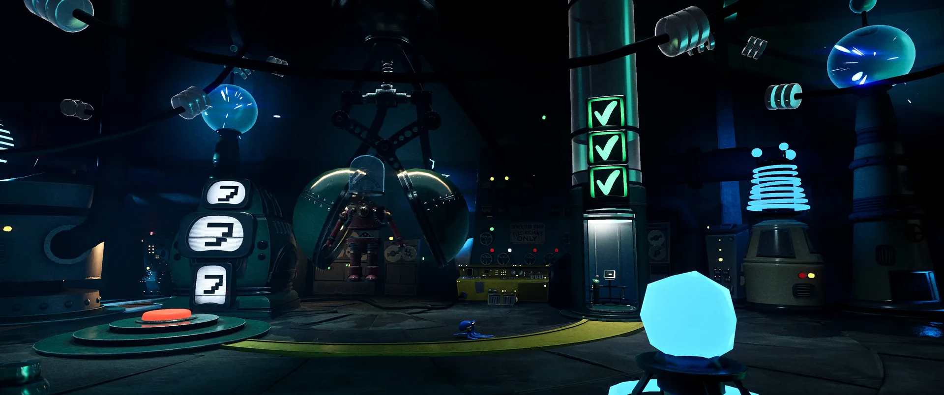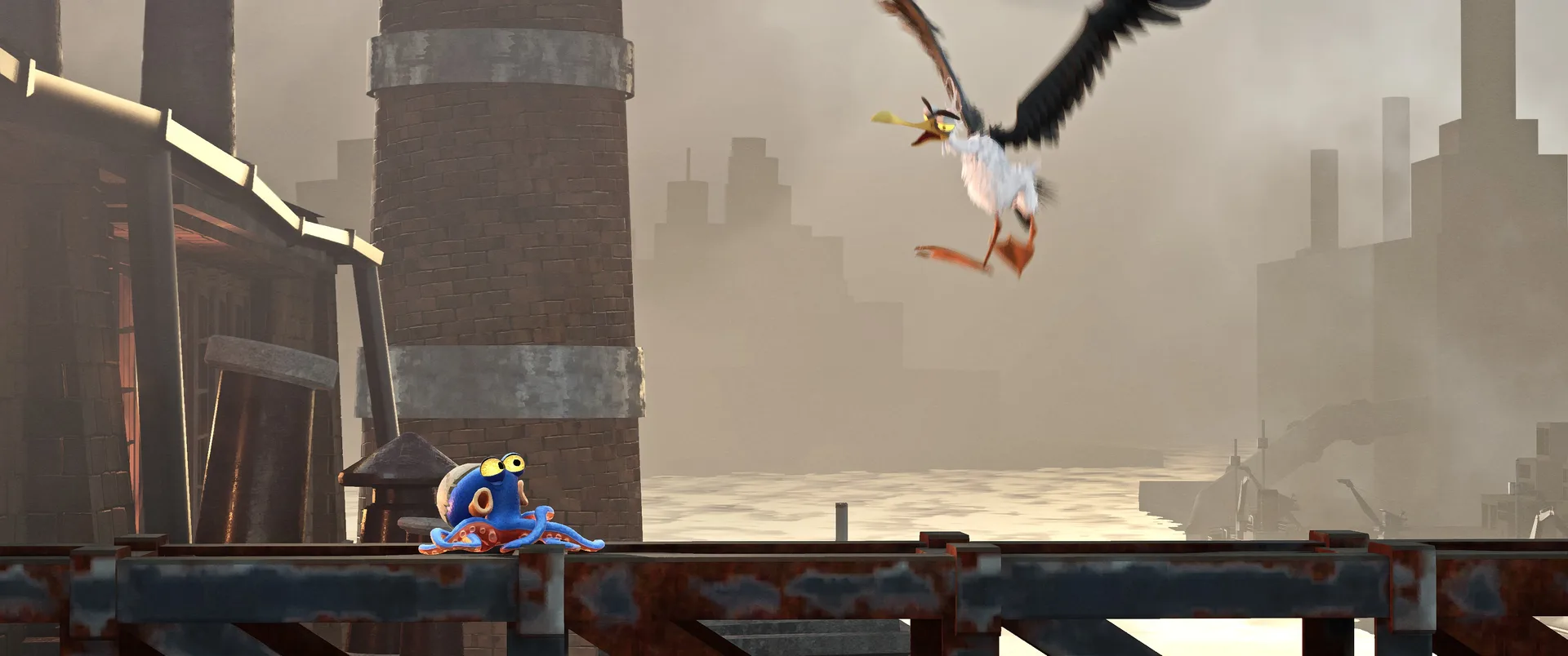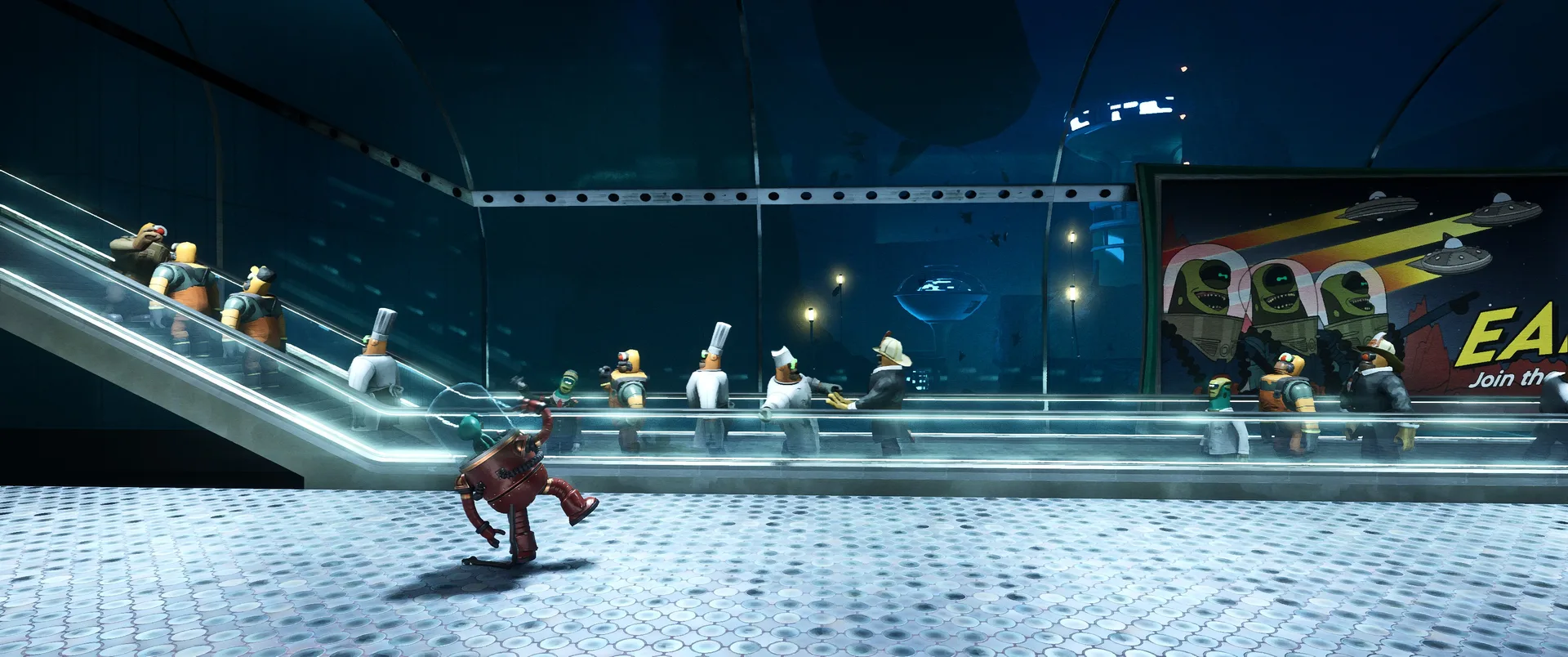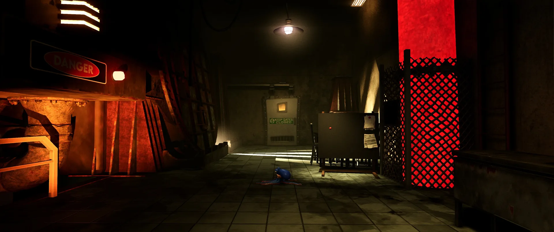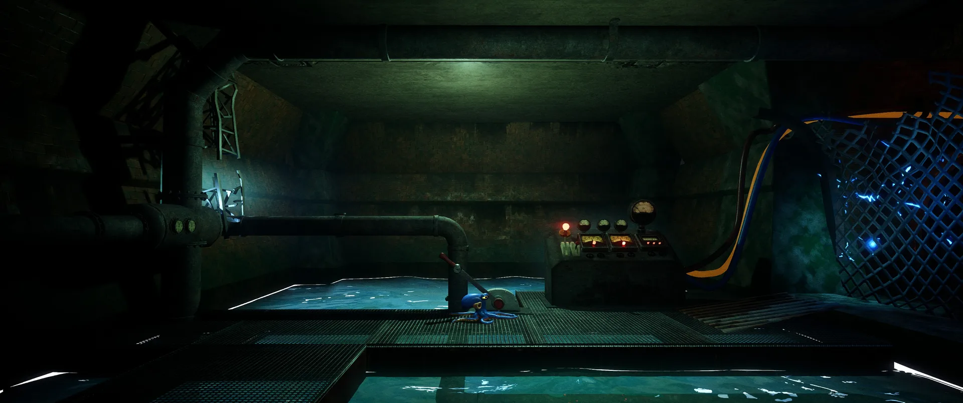 Hra nás hází do role Darwina, chobotnice, která rozhodně nepatří na talíř. Úvodní expozice vás rychle seznámí s krutou realitou, Darwin byl vytržen, ze svého přirozeného domova v korálových útesech a uvězněn v hypermoderním, sterilním a dosti děsivém komplexu společnosti UFOOD INC. Tato korporace se pod rouškou řešení světového hladu věnuje genetickým modifikacím, které hranice etiky nechaly dávno za sebou. Laboratoře nejsou jen prázdné kulisy, jsou plné náznáků o tom, co se zde skutečně děje. Od podivných vzorků v kádích, až po znepokojivé poznámky na nástěnkách, kterou dokreslují už tak mrazivou atmosféru místa. Co je na hře skutečně fascinující, je způsob vyprávění. Nenajdete zde žádná dialogová okna, ani otravné textové tutoriály, které by vás neustále vytrhávaly z imerze. Vše se dozvídate přes "environmental storytelling". Vývojáři zde odvedli mistrovskou práci v naraci skrze detaily - pohozené dokumenty, výrazy v tvářích vědců, nebo postupně se měnící architektura komplexu od nablýskaných kanceláří až po špinavé technické zázemí plné rezavého potrubí. Darwinovy emoce jsou navíc díky špičkové animaci naprosto čitelné. Vidíte jeho autentický strach, když se kolem proplíží těžkopádný strážný robot, i jeho až dětsky čisté nadšení, když objeví cestu ven z klaustrofobní šachty.