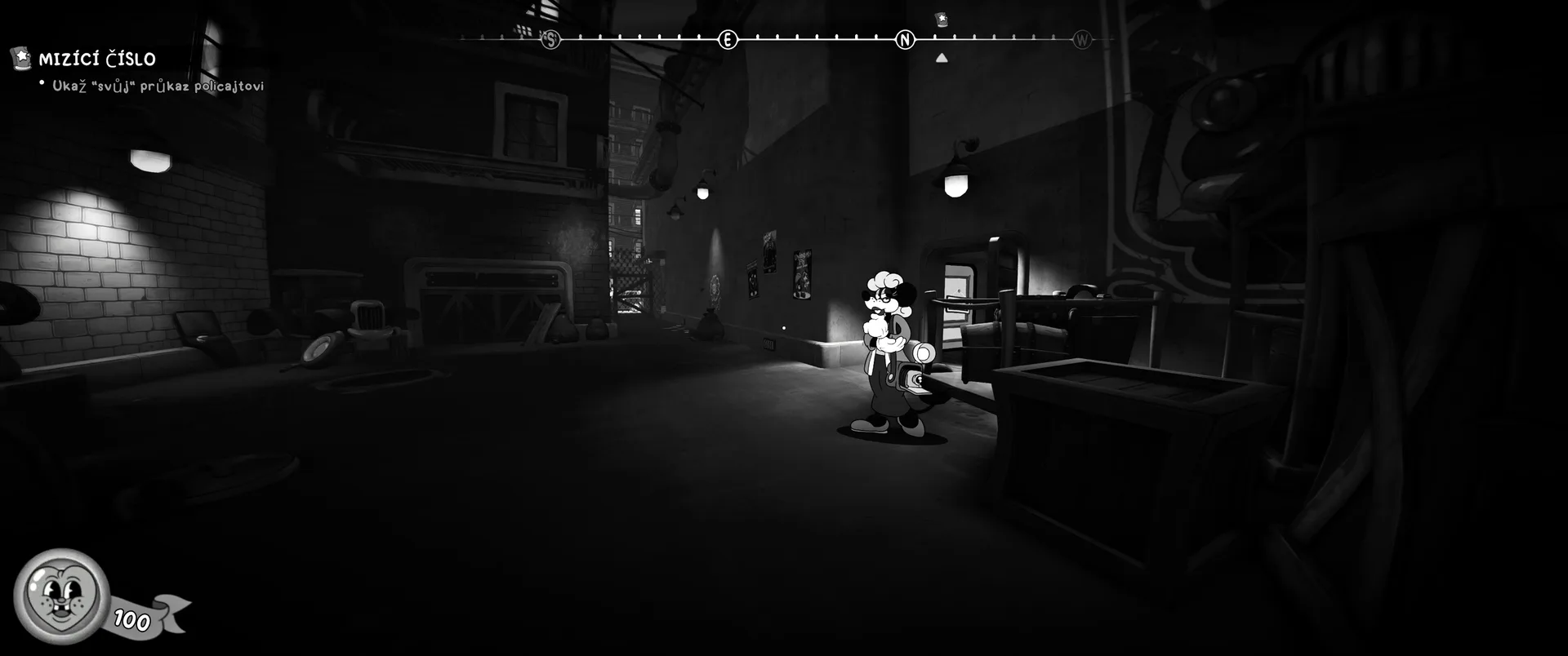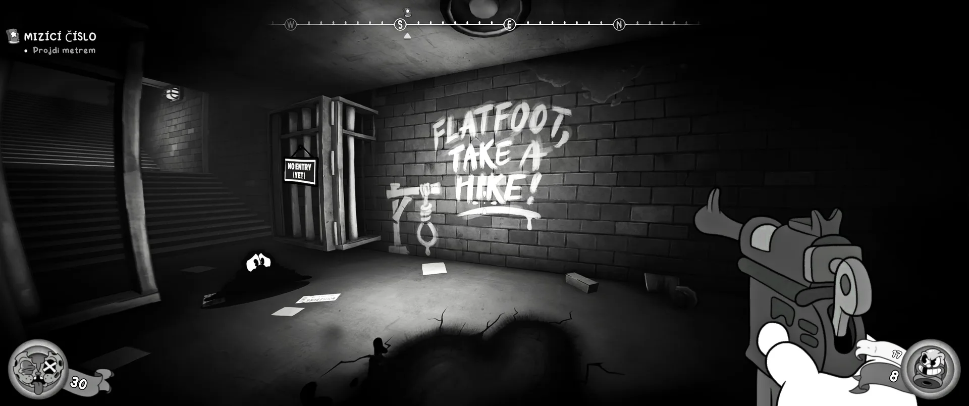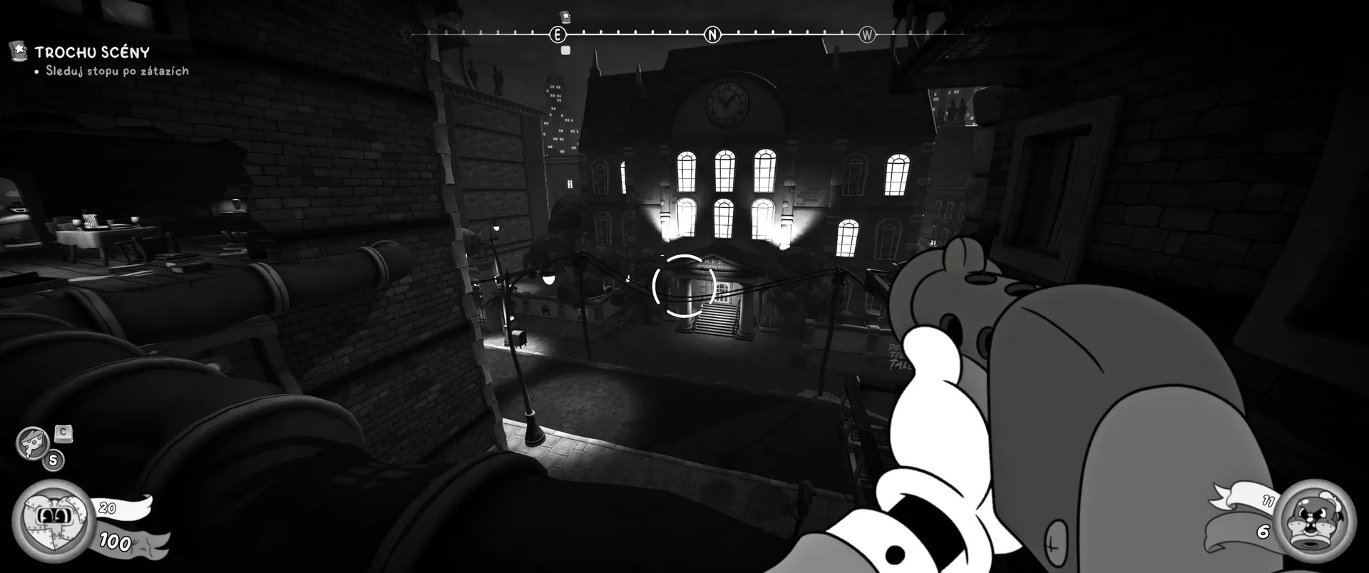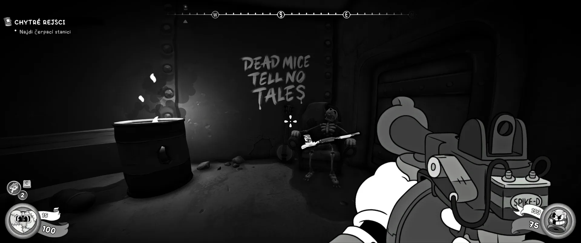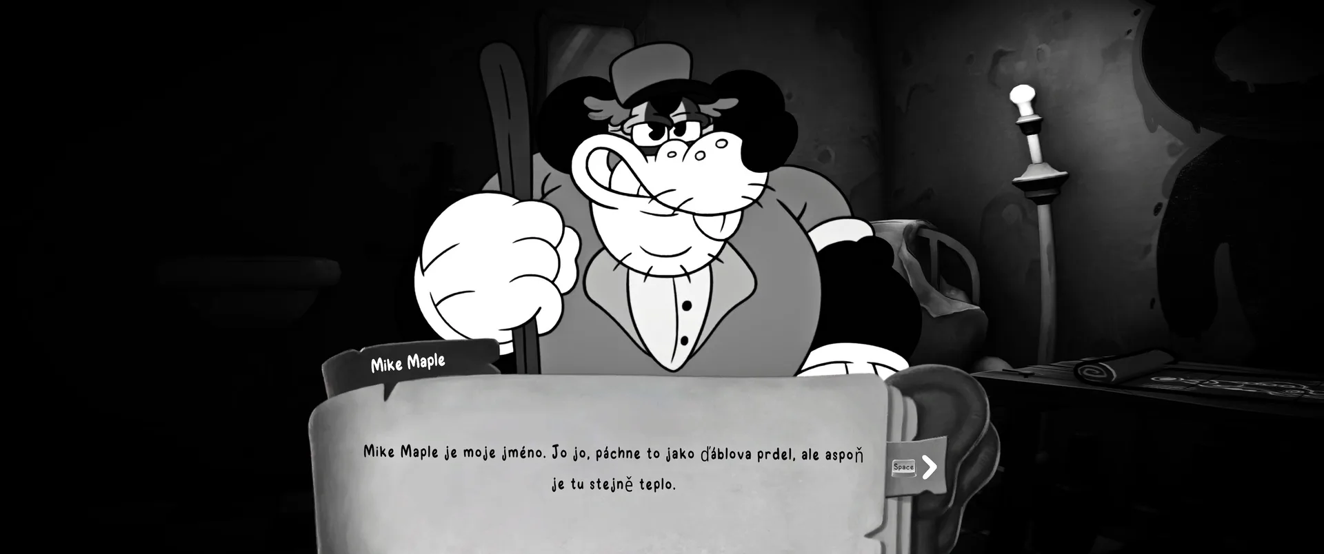Vizuální styl rubber hose, definující ranou animaci 30. let, není v MOUSE jen laciným pozlátkem, ale naprostým a neoddělitelným jádrem celého zážitku. Mouseburg vás provede neuvěřitelně variabilními lokacemi, které neustále osvěžují vizuální vjem. Od zakouřených jazzových klubů plných nelegálního sýra se plynule přesunete do monumentální městské opery, kde se mezi závěsy a zlatem zdobenými balkóny skrývají hrozivé stíny gangsterů. Skutečný vrchol však přichází v momentech, kdy hra začne citovat klasické horory. Jedna z nejpůsobivějších kapitol vás zavede do vesnice na motivy Ospalé díry, kde atmosféra houstne víc než inkoust v detektivově kalamáři. Velice často jsem narazil momenty, které vám vyrazí dech – například když v koutě objevíte kostru s nápisem „Dead Mice Tell No Tales“. Tento geniální odkaz na Piráty z Karibiku je naprostý vrchol a bomba, která potvrzuje, s jakou láskou k detailům vývojáři ke hře přistoupili.