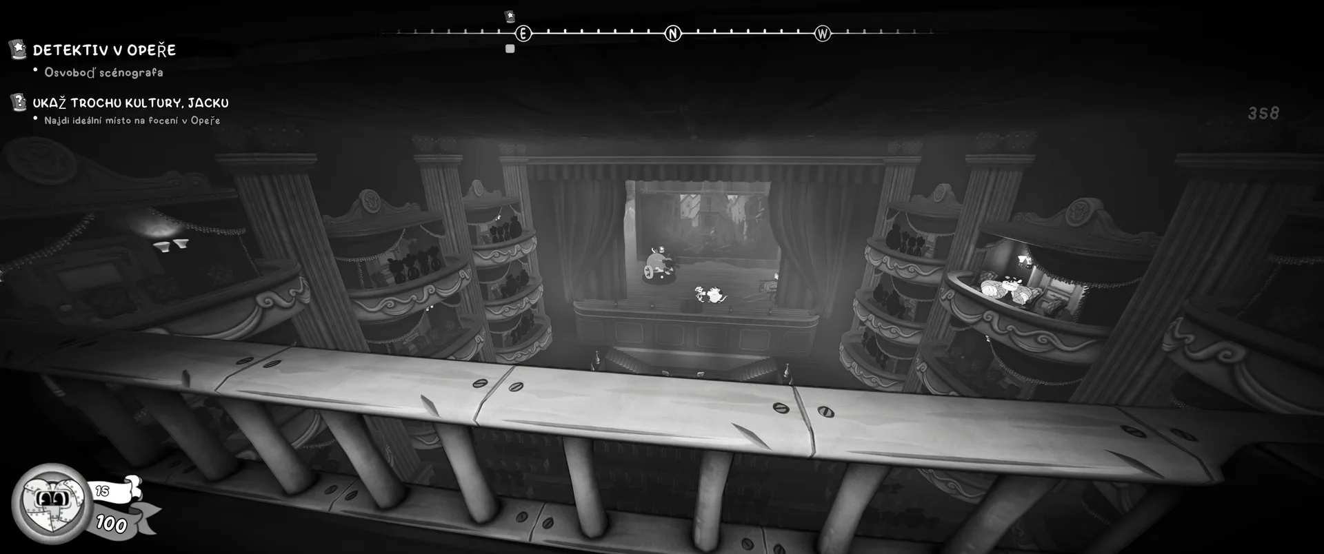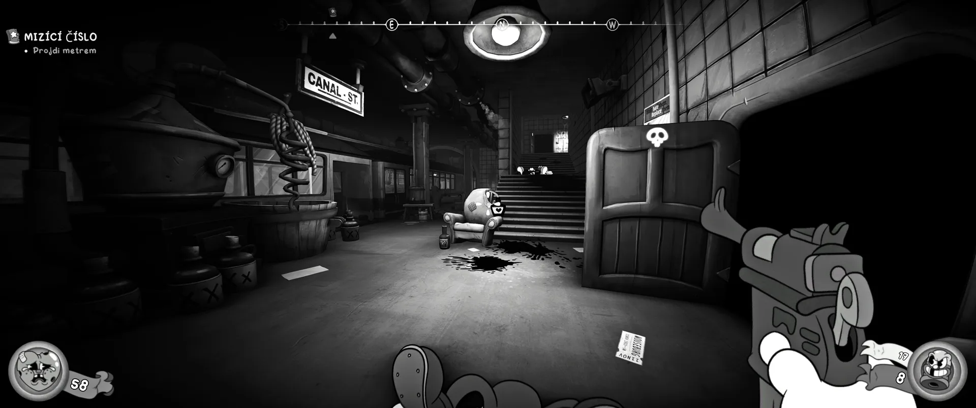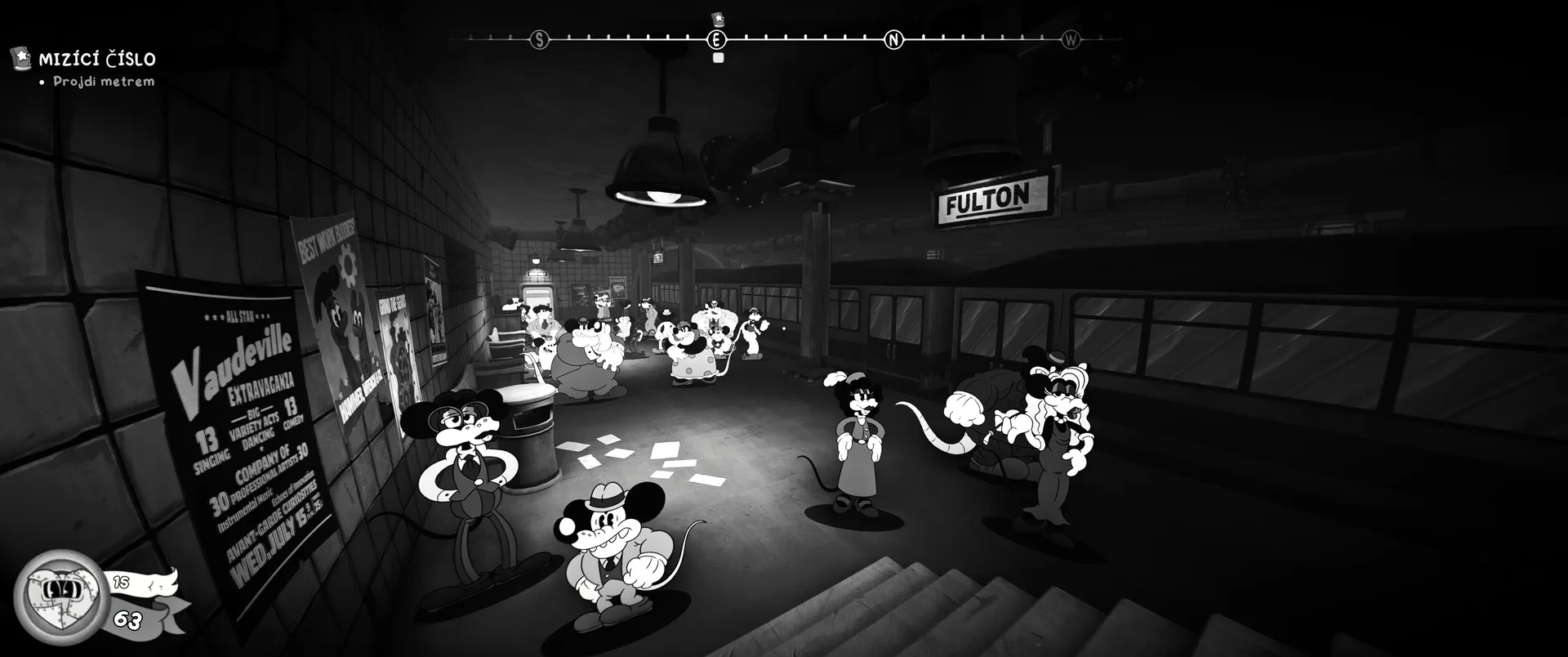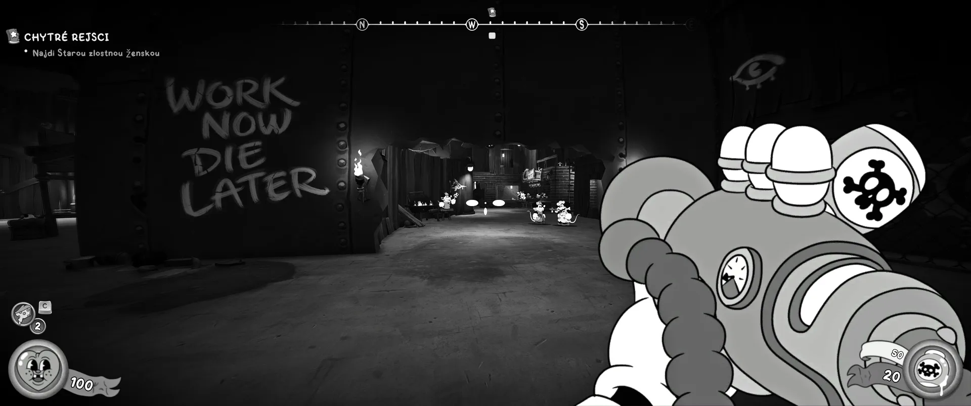 Vizuální styl rubber hose, definující ranou animaci 30. let, není v MOUSE jen laciným pozlátkem, ale naprostým a neoddělitelným jádrem celého zážitku. Mouseburg vás provede neuvěřitelně variabilními lokacemi, které neustále osvěžují vizuální vjem. Od zakouřených jazzových klubů plných nelegálního sýra se plynule přesunete do monumentální městské opery, kde se mezi závěsy a zlatem zdobenými balkóny skrývají hrozivé stíny gangsterů. Skutečný vrchol však přichází v momentech, kdy hra začne citovat klasické horory. Jedna z nejpůsobivějších kapitol vás zavede do vesnice na motivy Ospalé díry, kde atmosféra houstne víc než inkoust v detektivově kalamáři. Velice často jsem narazil momenty, které vám vyrazí dech – například když v koutě objevíte kostru s nápisem „Dead Mice Tell No Tales“. Tento geniální odkaz na Piráty z Karibiku je naprostý vrchol a bomba, která potvrzuje, s jakou láskou k detailům vývojáři ke hře přistoupili.