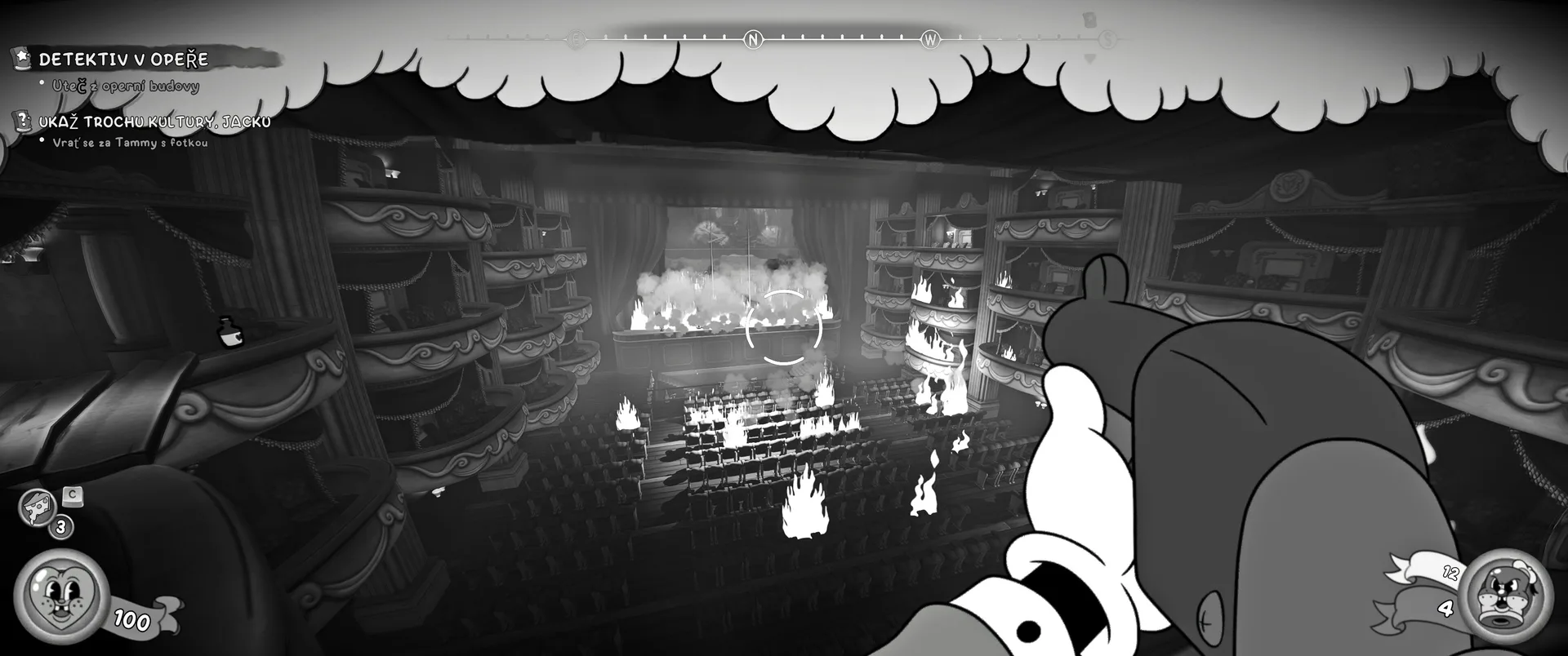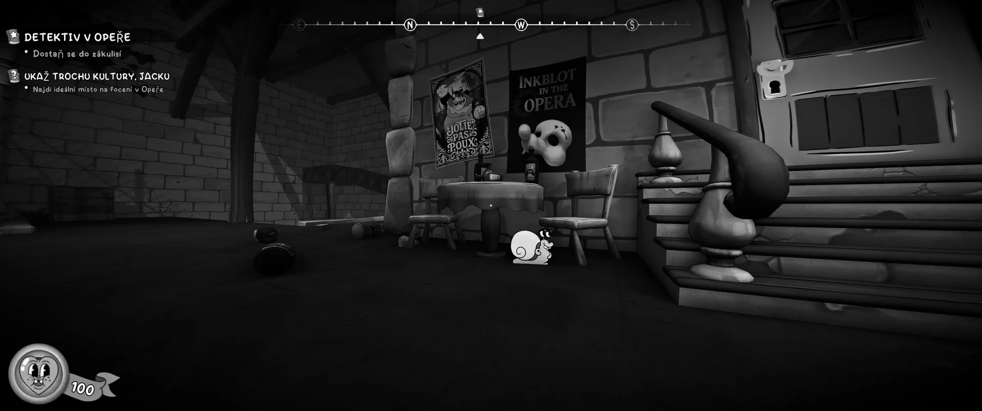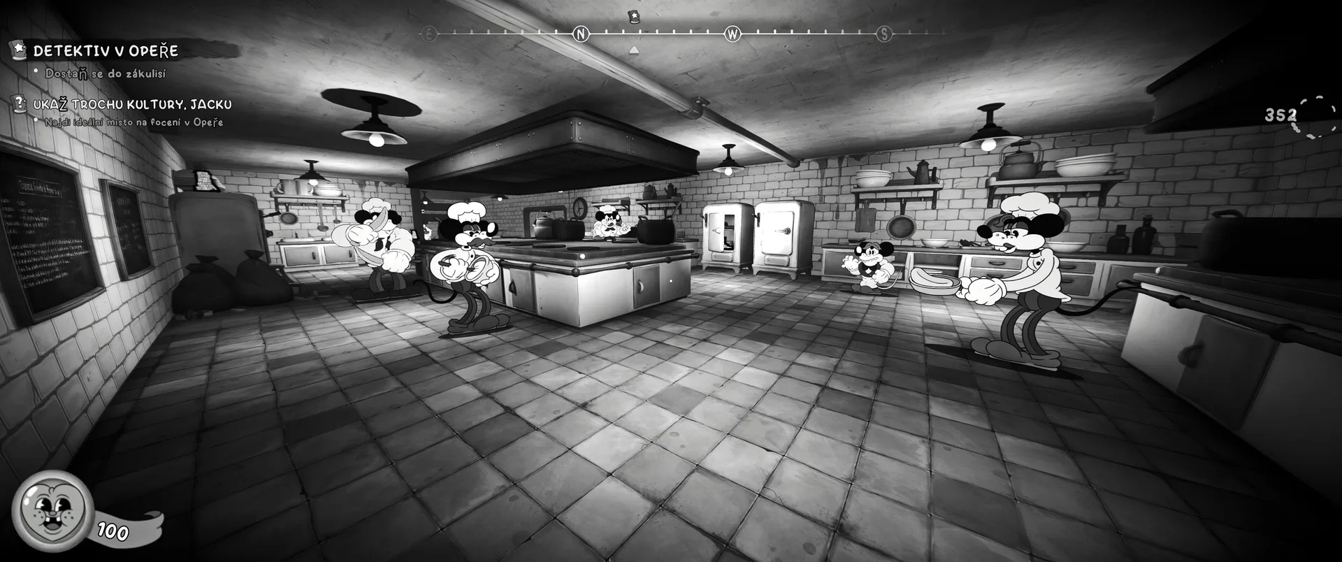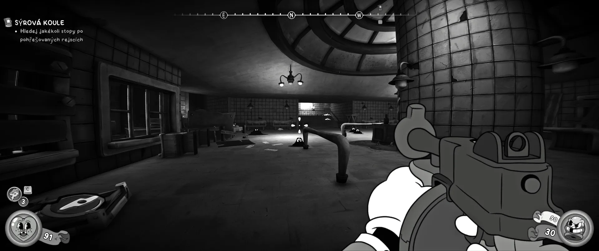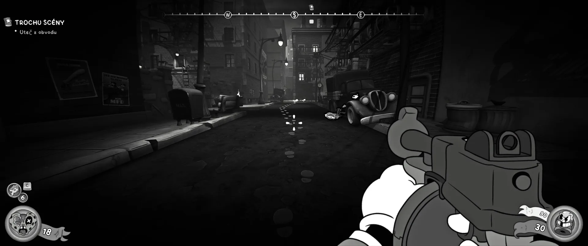 Vizuální styl rubber hose, definující ranou animaci 30. let, není v MOUSE jen laciným pozlátkem, ale naprostým a neoddělitelným jádrem celého zážitku. Mouseburg vás provede neuvěřitelně variabilními lokacemi, které neustále osvěžují vizuální vjem. Od zakouřených jazzových klubů plných nelegálního sýra se plynule přesunete do monumentální městské opery, kde se mezi závěsy a zlatem zdobenými balkóny skrývají hrozivé stíny gangsterů. Skutečný vrchol však přichází v momentech, kdy hra začne citovat klasické horory. Jedna z nejpůsobivějších kapitol vás zavede do vesnice na motivy Ospalé díry, kde atmosféra houstne víc než inkoust v detektivově kalamáři. Velice často jsem narazil momenty, které vám vyrazí dech – například když v koutě objevíte kostru s nápisem „Dead Mice Tell No Tales“. Tento geniální odkaz na Piráty z Karibiku je naprostý vrchol a bomba, která potvrzuje, s jakou láskou k detailům vývojáři ke hře přistoupili.