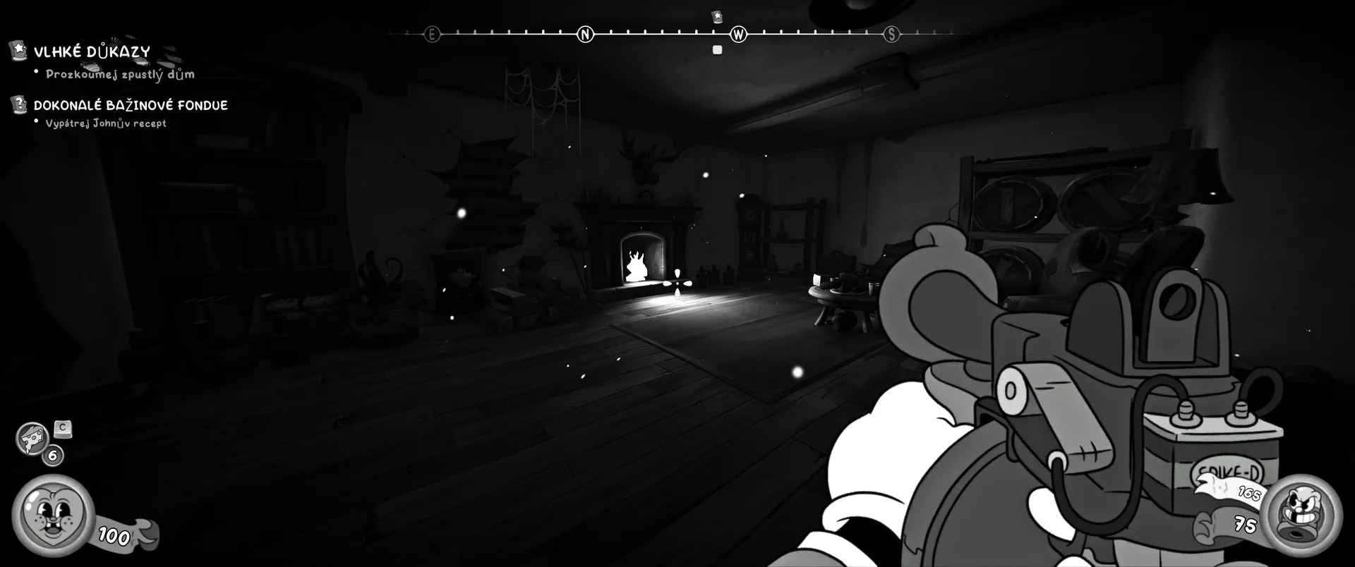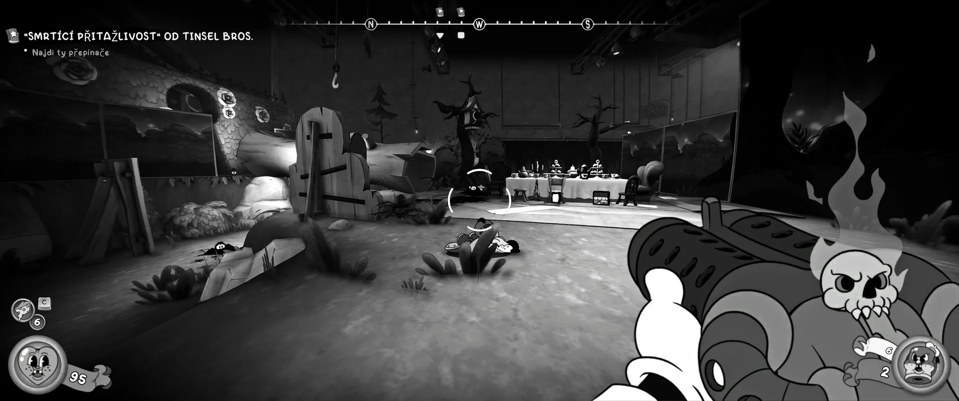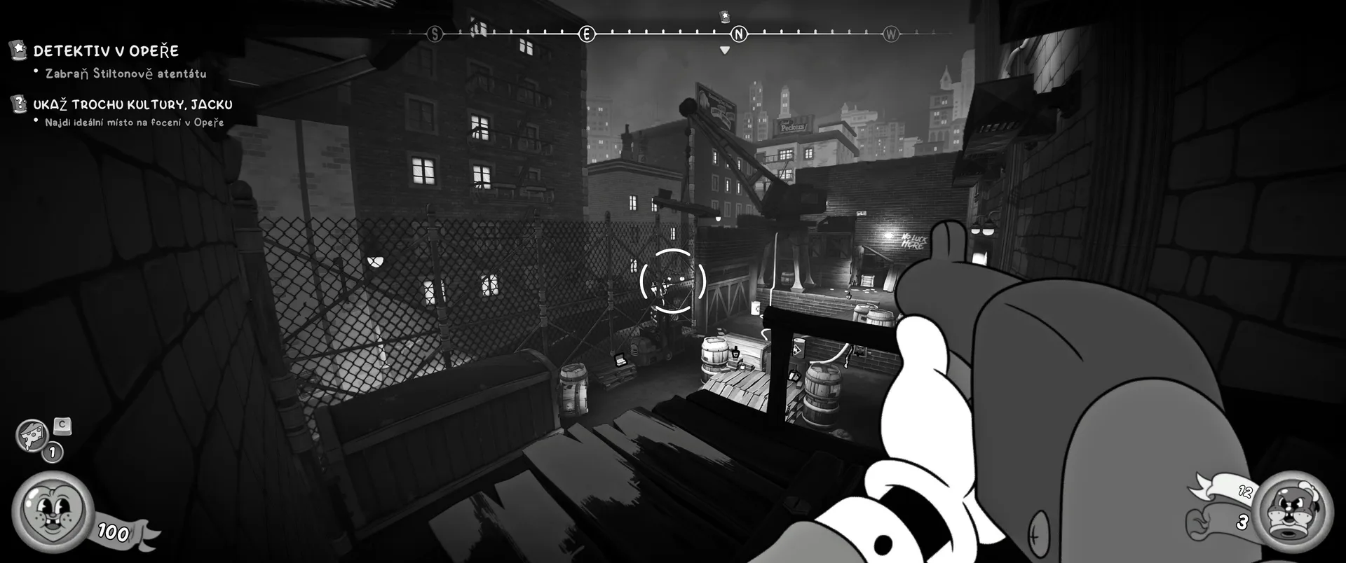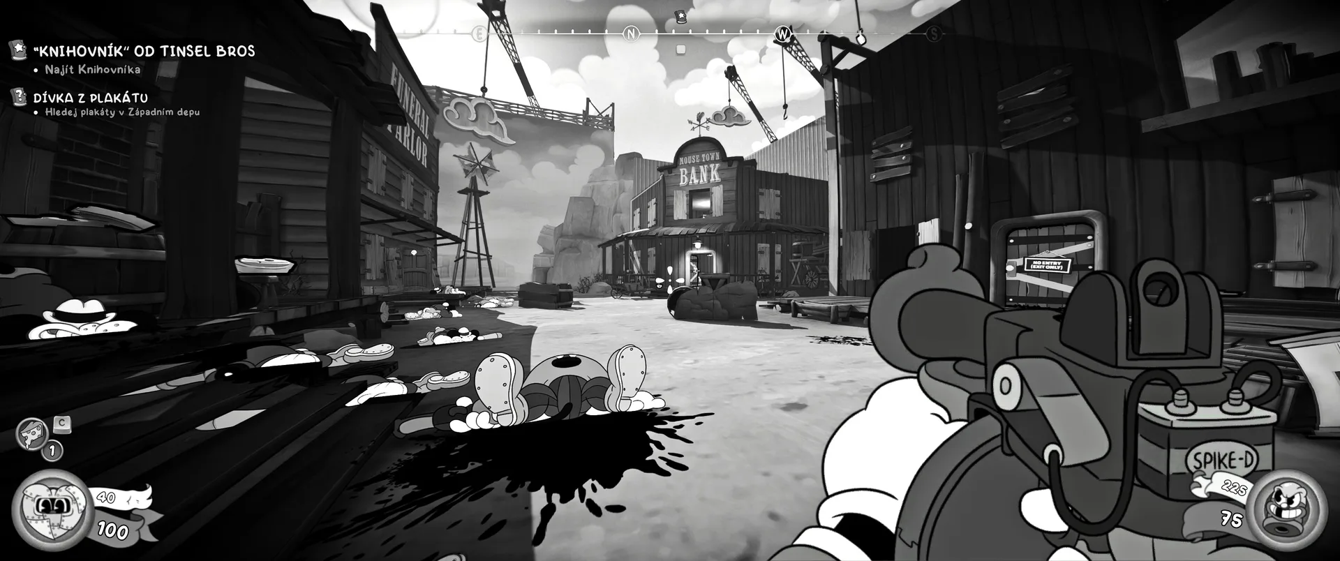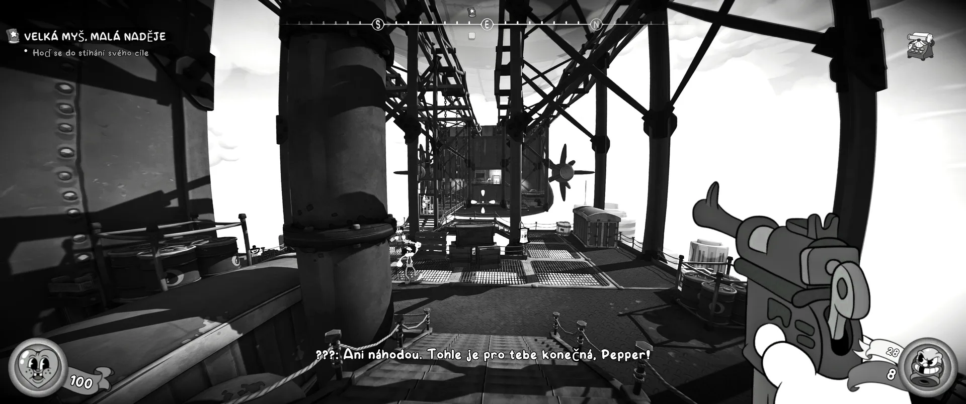 Vizuální styl rubber hose, definující ranou animaci 30. let, není v MOUSE jen laciným pozlátkem, ale naprostým a neoddělitelným jádrem celého zážitku. Mouseburg vás provede neuvěřitelně variabilními lokacemi, které neustále osvěžují vizuální vjem. Od zakouřených jazzových klubů plných nelegálního sýra se plynule přesunete do monumentální městské opery, kde se mezi závěsy a zlatem zdobenými balkóny skrývají hrozivé stíny gangsterů. Skutečný vrchol však přichází v momentech, kdy hra začne citovat klasické horory. Jedna z nejpůsobivějších kapitol vás zavede do vesnice na motivy Ospalé díry, kde atmosféra houstne víc než inkoust v detektivově kalamáři. Velice často jsem narazil momenty, které vám vyrazí dech – například když v koutě objevíte kostru s nápisem „Dead Mice Tell No Tales“. Tento geniální odkaz na Piráty z Karibiku je naprostý vrchol a bomba, která potvrzuje, s jakou láskou k detailům vývojáři ke hře přistoupili.