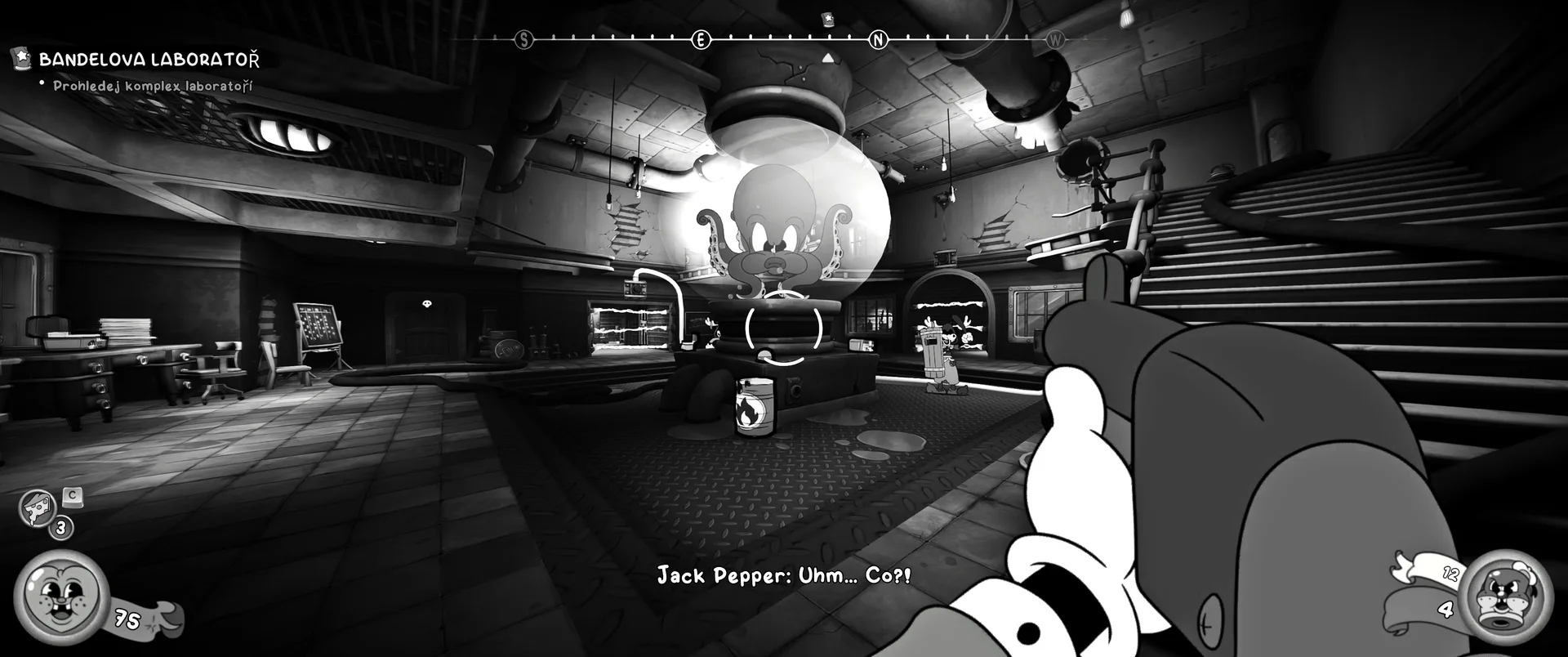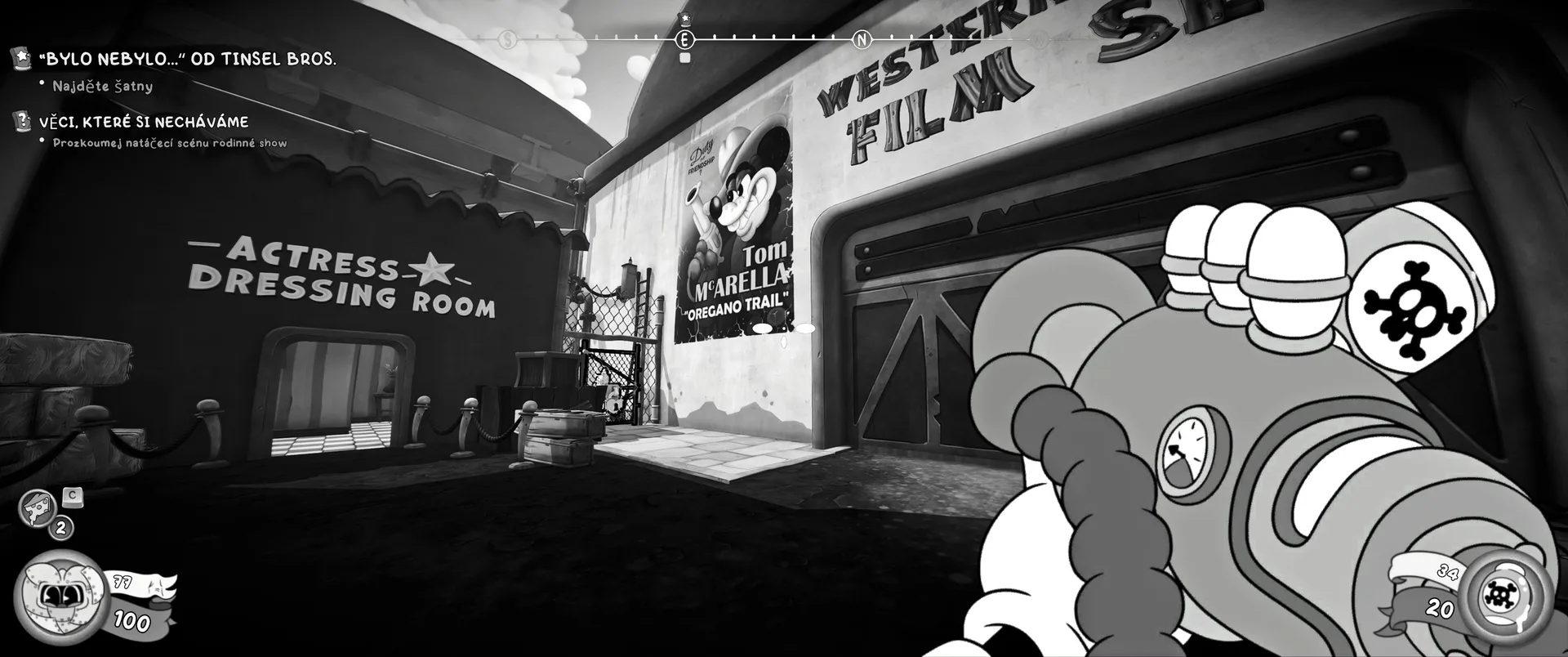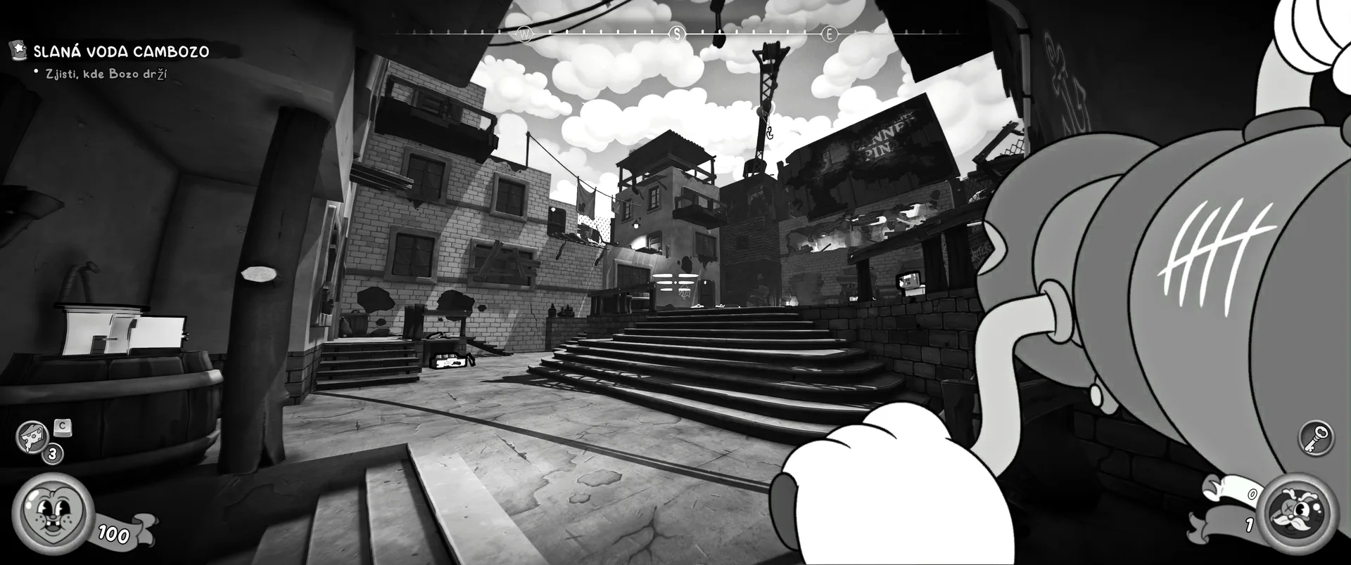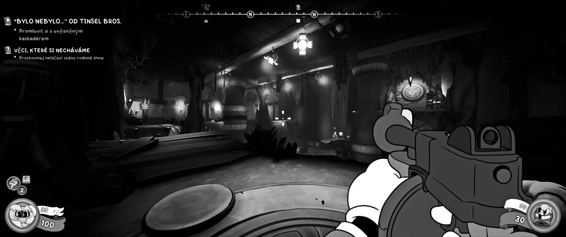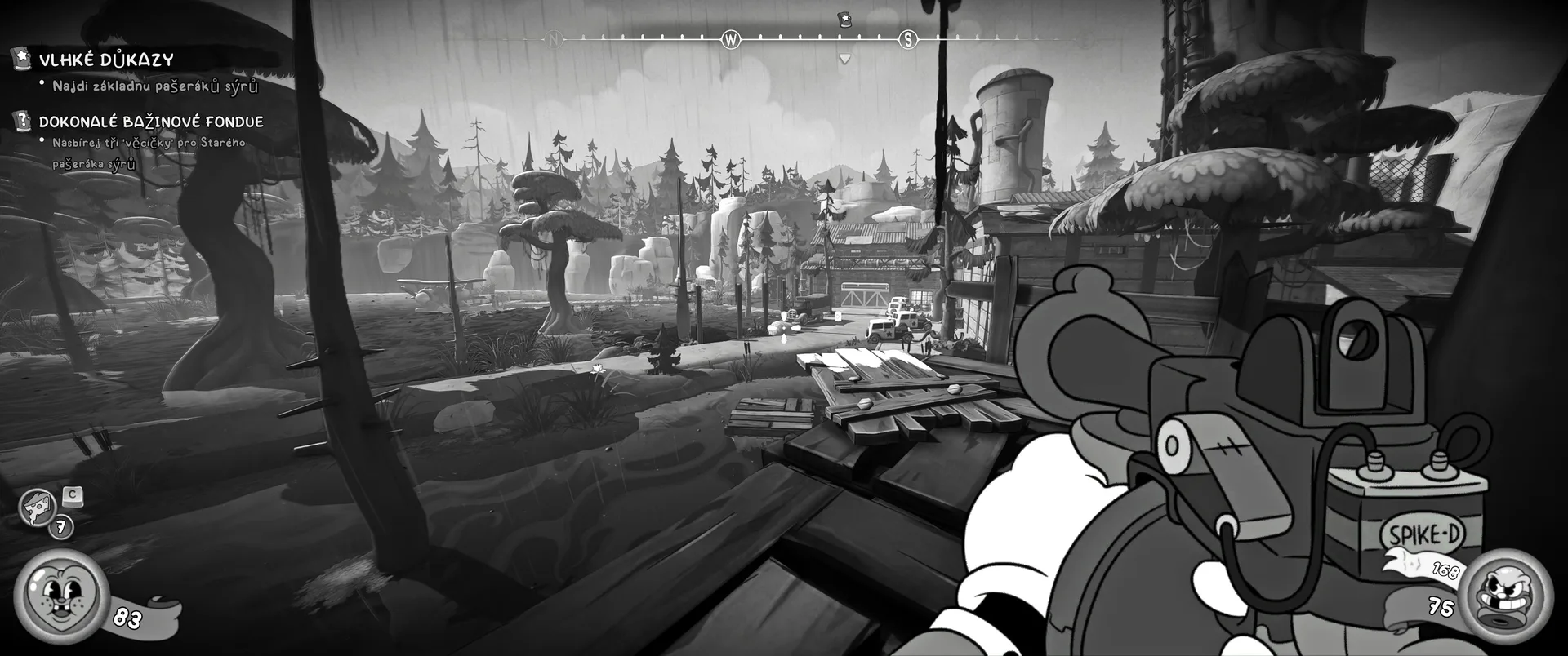 Vizuální styl rubber hose, definující ranou animaci 30. let, není v MOUSE jen laciným pozlátkem, ale naprostým a neoddělitelným jádrem celého zážitku. Mouseburg vás provede neuvěřitelně variabilními lokacemi, které neustále osvěžují vizuální vjem. Od zakouřených jazzových klubů plných nelegálního sýra se plynule přesunete do monumentální městské opery, kde se mezi závěsy a zlatem zdobenými balkóny skrývají hrozivé stíny gangsterů. Skutečný vrchol však přichází v momentech, kdy hra začne citovat klasické horory. Jedna z nejpůsobivějších kapitol vás zavede do vesnice na motivy Ospalé díry, kde atmosféra houstne víc než inkoust v detektivově kalamáři. Velice často jsem narazil momenty, které vám vyrazí dech – například když v koutě objevíte kostru s nápisem „Dead Mice Tell No Tales“. Tento geniální odkaz na Piráty z Karibiku je naprostý vrchol a bomba, která potvrzuje, s jakou láskou k detailům vývojáři ke hře přistoupili.