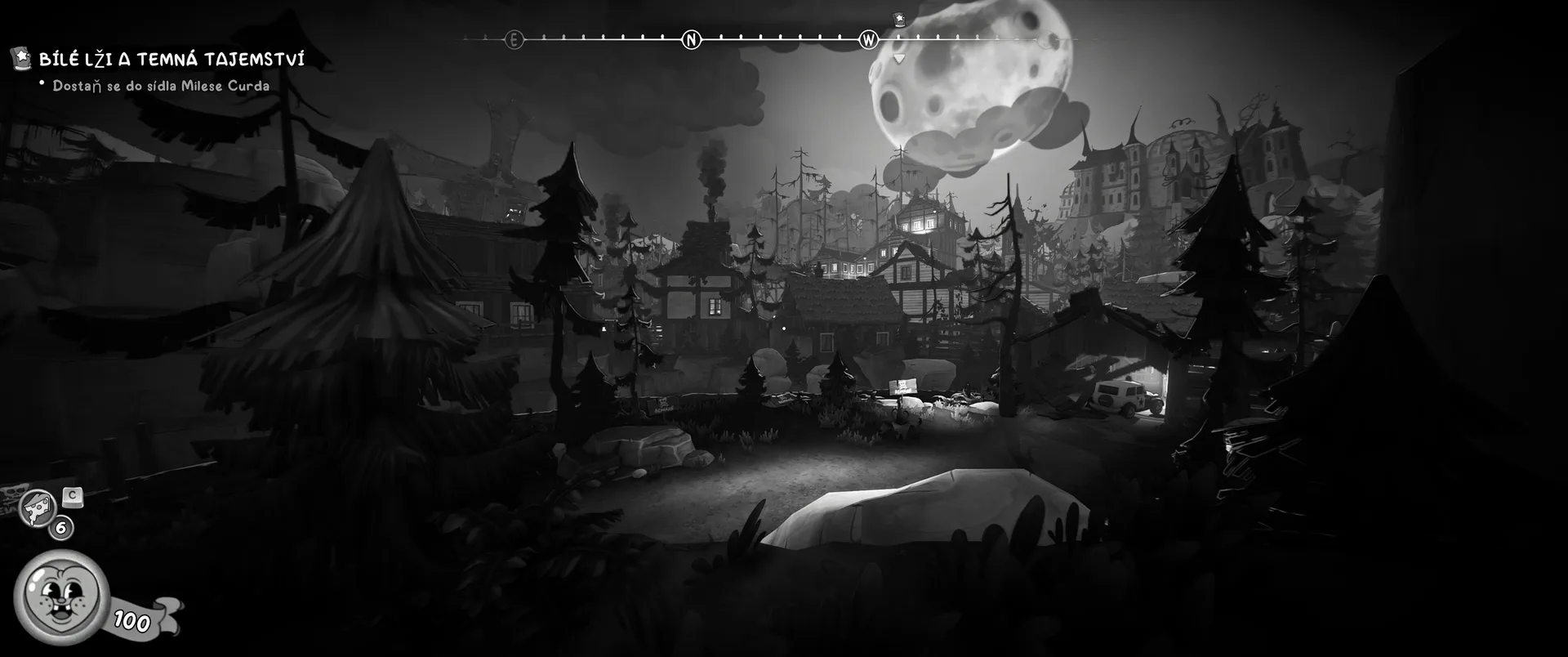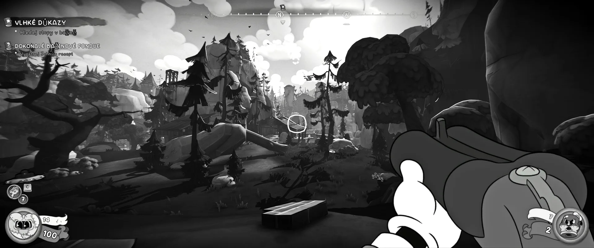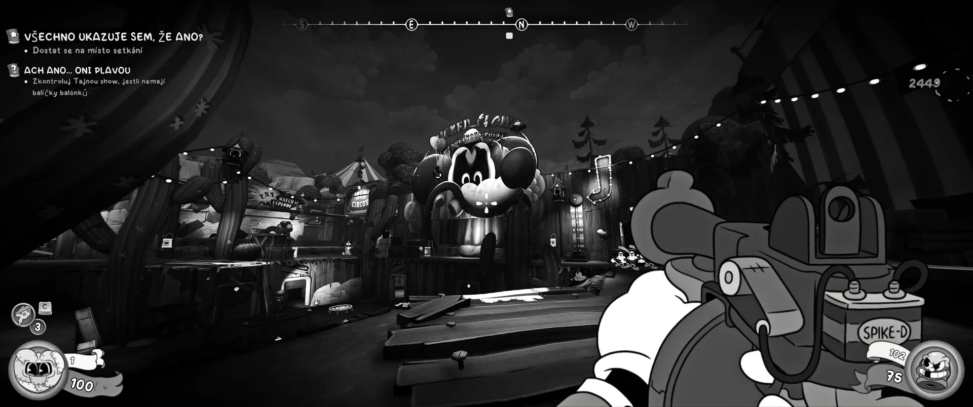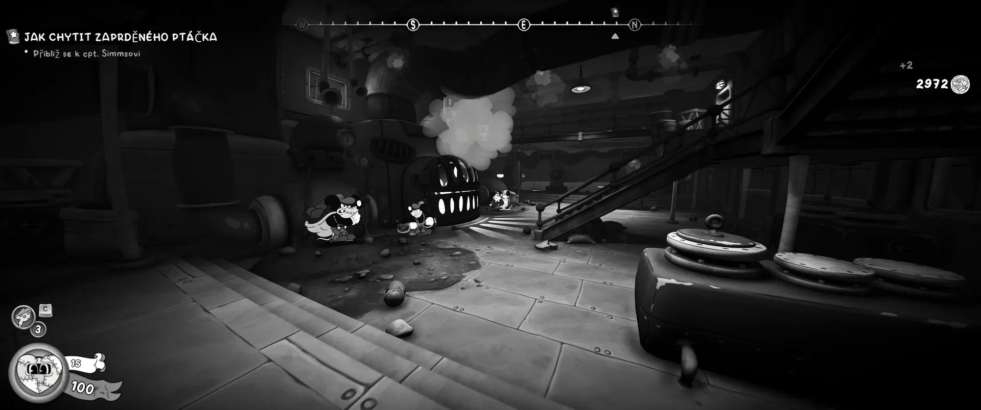 Vizuální styl rubber hose, definující ranou animaci 30. let, není v MOUSE jen laciným pozlátkem, ale naprostým a neoddělitelným jádrem celého zážitku. Mouseburg vás provede neuvěřitelně variabilními lokacemi, které neustále osvěžují vizuální vjem. Od zakouřených jazzových klubů plných nelegálního sýra se plynule přesunete do monumentální městské opery, kde se mezi závěsy a zlatem zdobenými balkóny skrývají hrozivé stíny gangsterů. Skutečný vrchol však přichází v momentech, kdy hra začne citovat klasické horory. Jedna z nejpůsobivějších kapitol vás zavede do vesnice na motivy Ospalé díry, kde atmosféra houstne víc než inkoust v detektivově kalamáři. Velice často jsem narazil momenty, které vám vyrazí dech – například když v koutě objevíte kostru s nápisem „Dead Mice Tell No Tales“. Tento geniální odkaz na Piráty z Karibiku je naprostý vrchol a bomba, která potvrzuje, s jakou láskou k detailům vývojáři ke hře přistoupili.