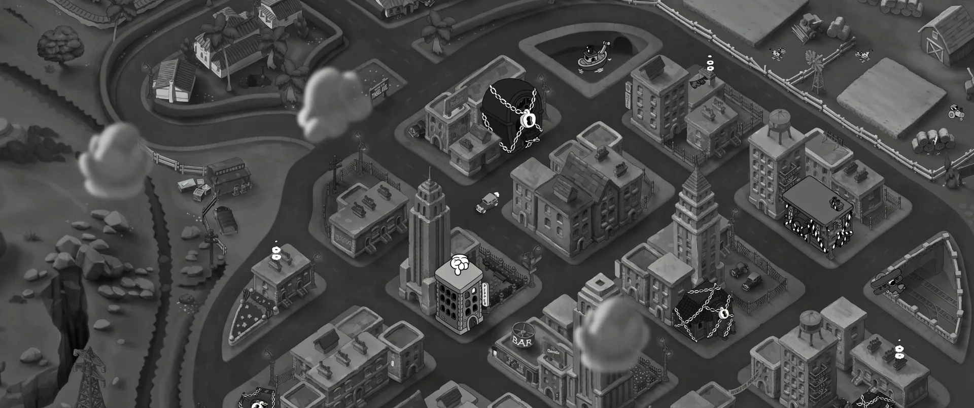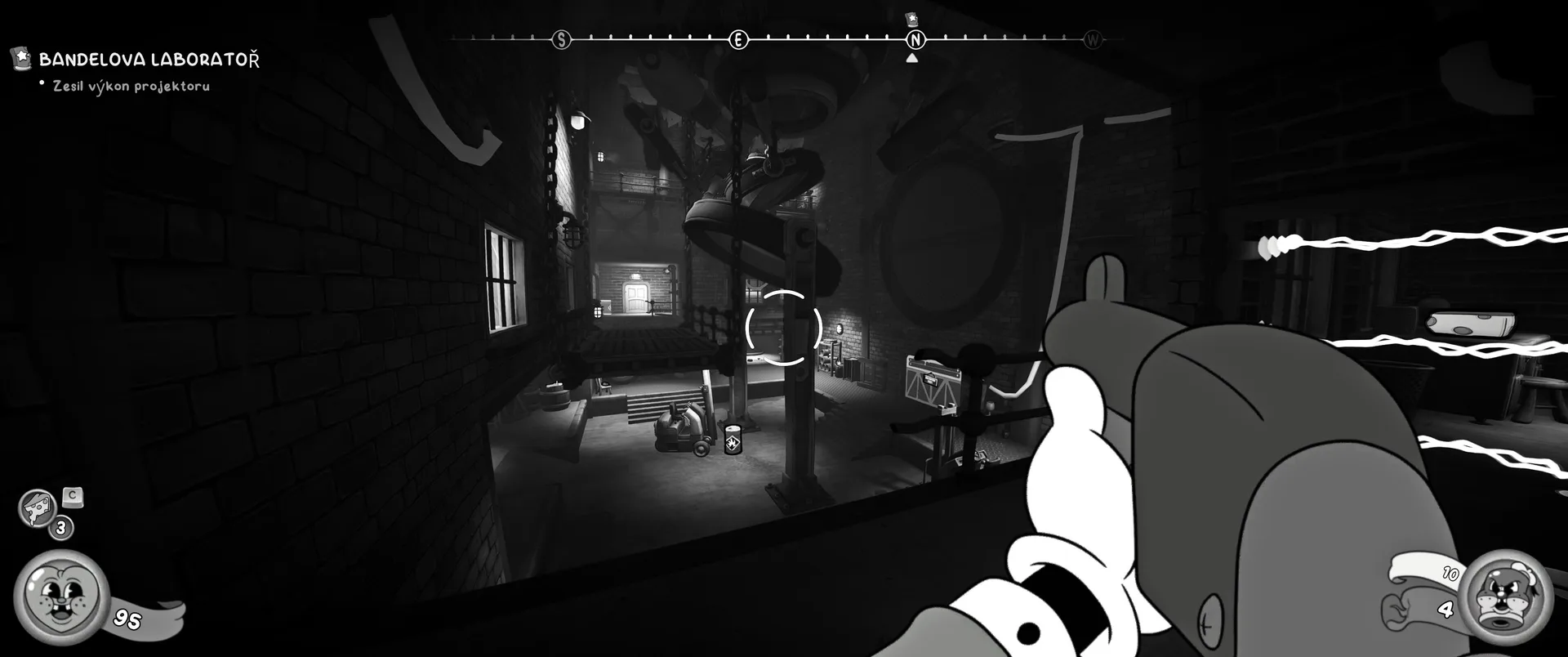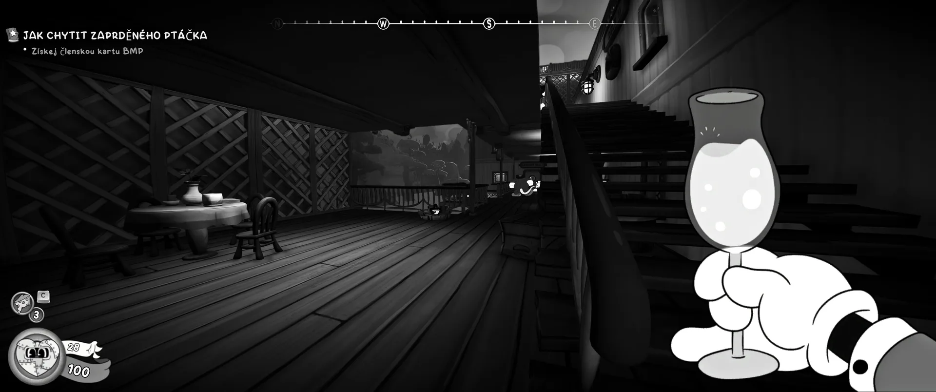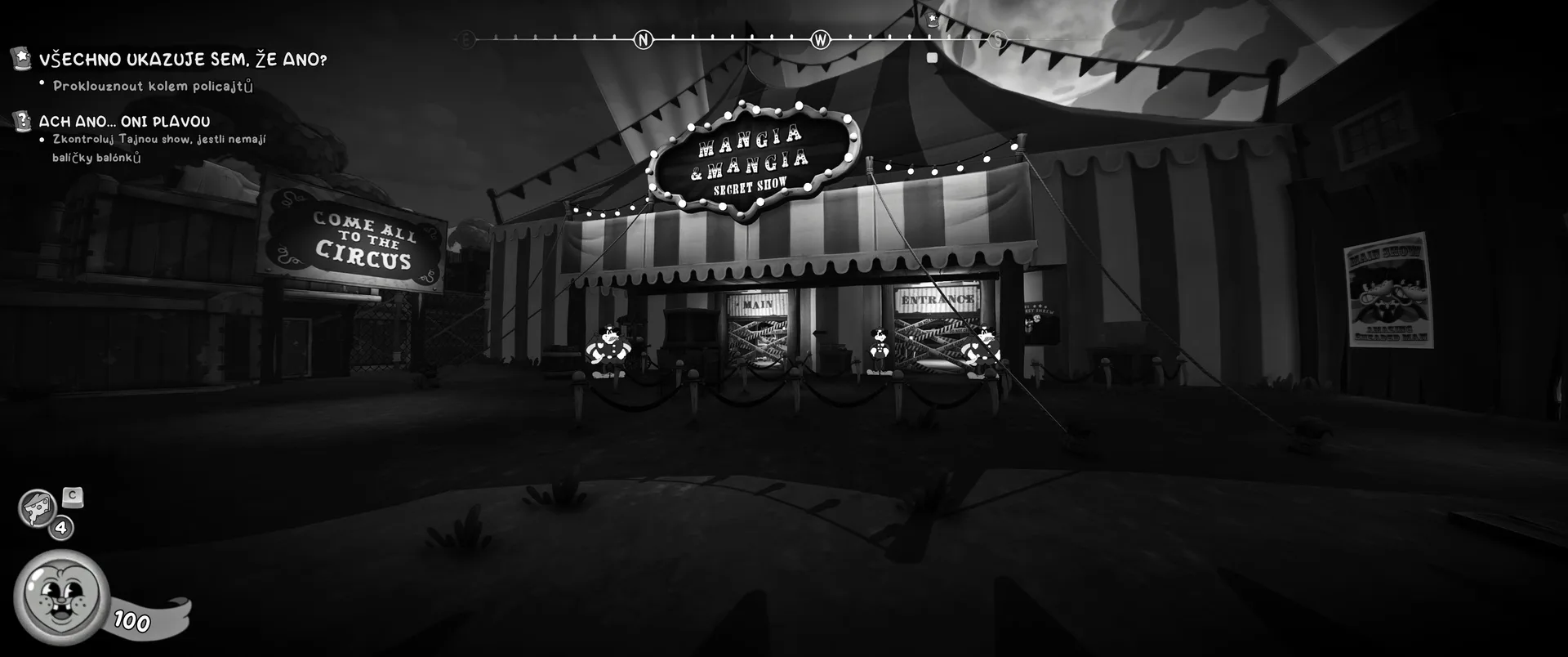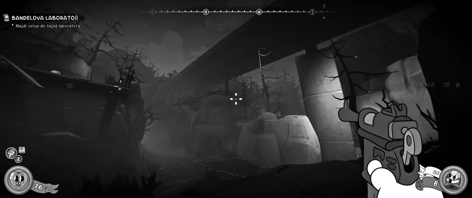 Vizuální styl rubber hose, definující ranou animaci 30. let, není v MOUSE jen laciným pozlátkem, ale naprostým a neoddělitelným jádrem celého zážitku. Mouseburg vás provede neuvěřitelně variabilními lokacemi, které neustále osvěžují vizuální vjem. Od zakouřených jazzových klubů plných nelegálního sýra se plynule přesunete do monumentální městské opery, kde se mezi závěsy a zlatem zdobenými balkóny skrývají hrozivé stíny gangsterů. Skutečný vrchol však přichází v momentech, kdy hra začne citovat klasické horory. Jedna z nejpůsobivějších kapitol vás zavede do vesnice na motivy Ospalé díry, kde atmosféra houstne víc než inkoust v detektivově kalamáři. Velice často jsem narazil momenty, které vám vyrazí dech – například když v koutě objevíte kostru s nápisem „Dead Mice Tell No Tales“. Tento geniální odkaz na Piráty z Karibiku je naprostý vrchol a bomba, která potvrzuje, s jakou láskou k detailům vývojáři ke hře přistoupili.