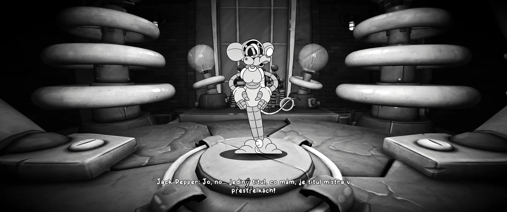 MOUSE jde proti moderním trendům automatického léčení, tady vládne klasický ukazatel HP a štítu. Zdraví doplňujete pojídáním sýra, který si můžete nést v inventáři, nebo pomocí léčivých lahviček, které se spotřebují ihned po sebrání. Souboje navíc obohacují výbušné sudy, ale i speciality jako sudy s kyselinou, které nepřátele leptají, nebo mrazicí sudy, které gangstery promění v ledové sochy. Celou atmosféru podtrhuje obsazení Troye Bakera do role Jacka Peppera. Jeho cynický hlas dává hře duši, zejména při konfrontacích s ikonickými bossy, které si berou inspiraci z Draculy, nebo Frankensteinova Monstra. MOUSE není jen pastvou pro oči, je to i koncert pro uši. Skvostný jazzový doprovod je tou pomyslnou třešničkou, která z noir atmosféry dělá nezapomenutelnou jízdu. Swingové pasáže reagují na každý váš krok a v momentě největší řežby se mění v agresivní bigbandovou smršť, která vás žene neustále vpřed. Zvukový design výstřelů má navíc ten správný syrový šmrnc starých detektivek, a když se spojí s ručně kreslenou animací, vzniká audiovizuální harmonie, která se neomrzí ani po desáté kapitole.