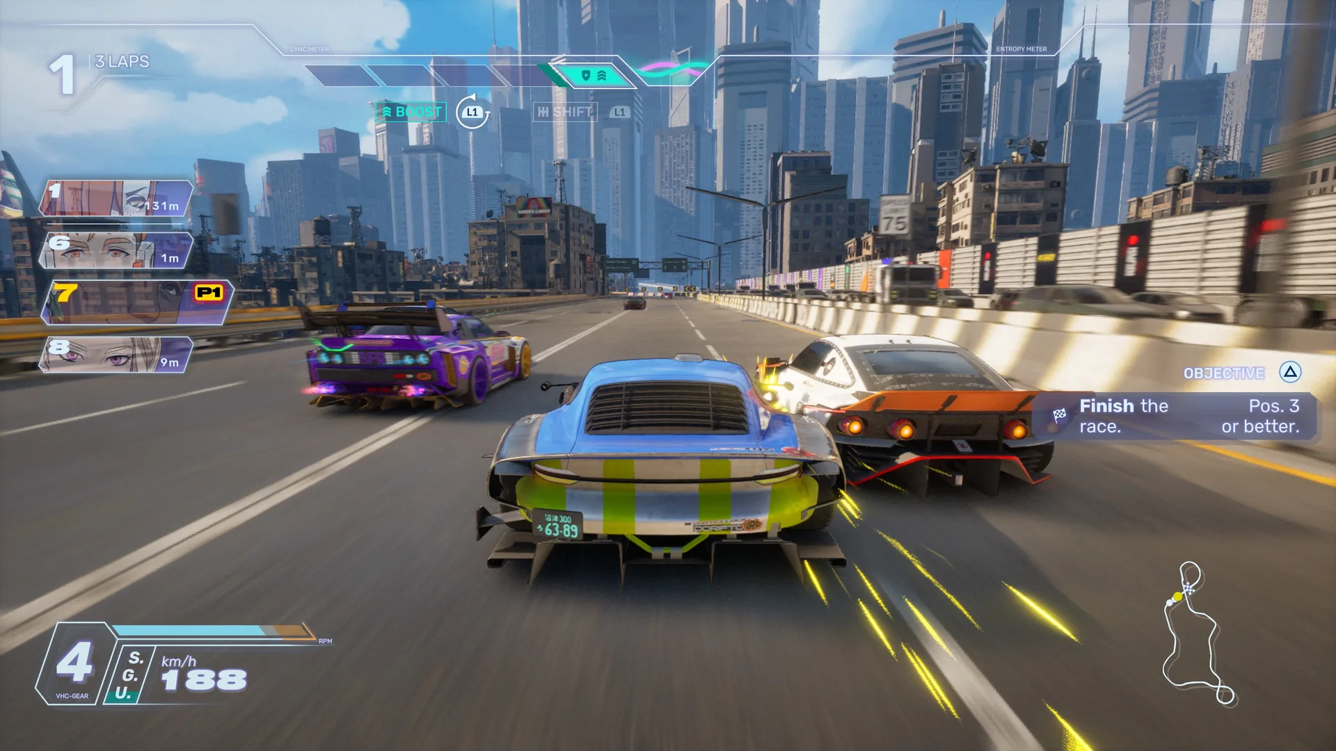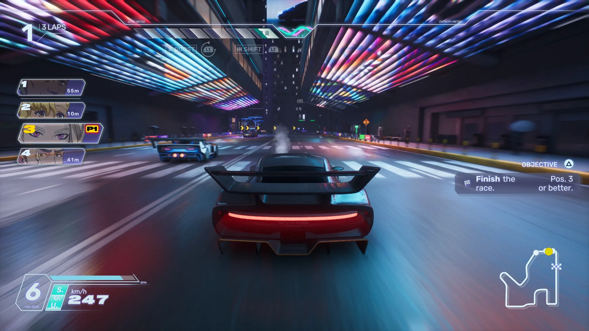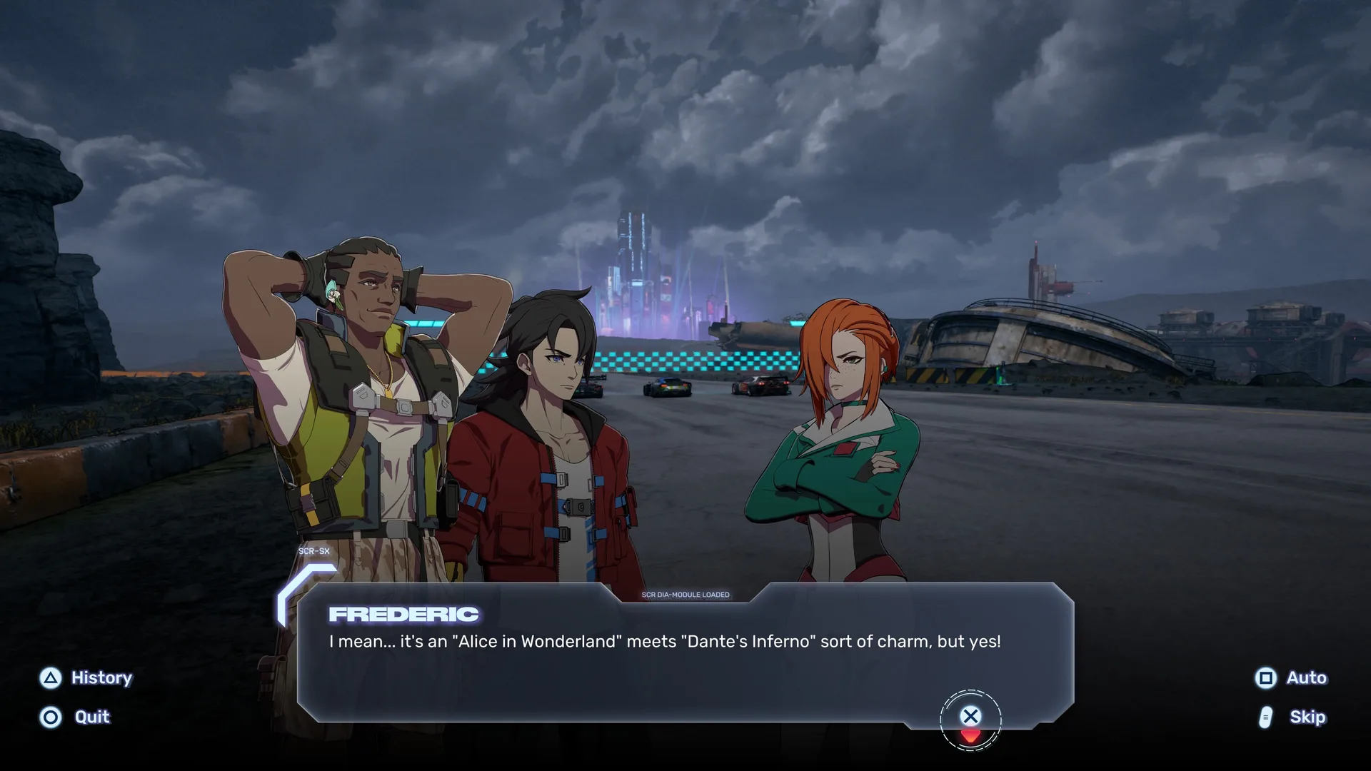 Turnaj The Tournament je totiž domovem různorodých frakcí, jejichž motivace jsou stejně odlišné jako jejich vozové parky. Potkáte zde například tým Green Reapers, tvořený bývalými vojáky pod vedením Hiroshiho Jacksona, kteří v turnaji vidí jedinou šanci na pomstu za smrt svého mentora, jehož vražda je s turnajem přímo spojená. Zcela jinou energii do závodů vnáší Strike Force Romanda, kdysi slavná dívčí idol skupina, která se znovu sjednotila, aby pod rouškou adrenalinových závodů vypátrala pravdu o zmizení jedné ze svých členek, jež byla v Neo Rey naposledy spatřena. Tuto směsici doplňuje cynická Anaconda Corp, zastupující zájmy zkorumpované megakorporace, pro niž jsou závody jen dalším nástrojem k upevnění totální moci nad městem a k umlčení nepohodlných svědků. Právě tento propletenec osobních tragédií a korporátních her dělá z kampaně něco víc než jen sled závodů, je to interaktivní anime, kde má každé vítězství svou narativní váhu a každá postava má v tomto nebezpečném světě co ztratit, přičemž tyto tři frakce rozhodně nejsou jedinými hráči, kteří do špinavých ulic Neo Rey vyslali své zástupce. K celkové pohlcující atmosféře města zásadně přispívá také naprosto fenomenální soundtrack. Jde o úderný mix agresivního synthwavu a techna, který v uších duní přesně v rytmu zběsilé akce a dodává závodům ten správný kyberpunkový říz.
