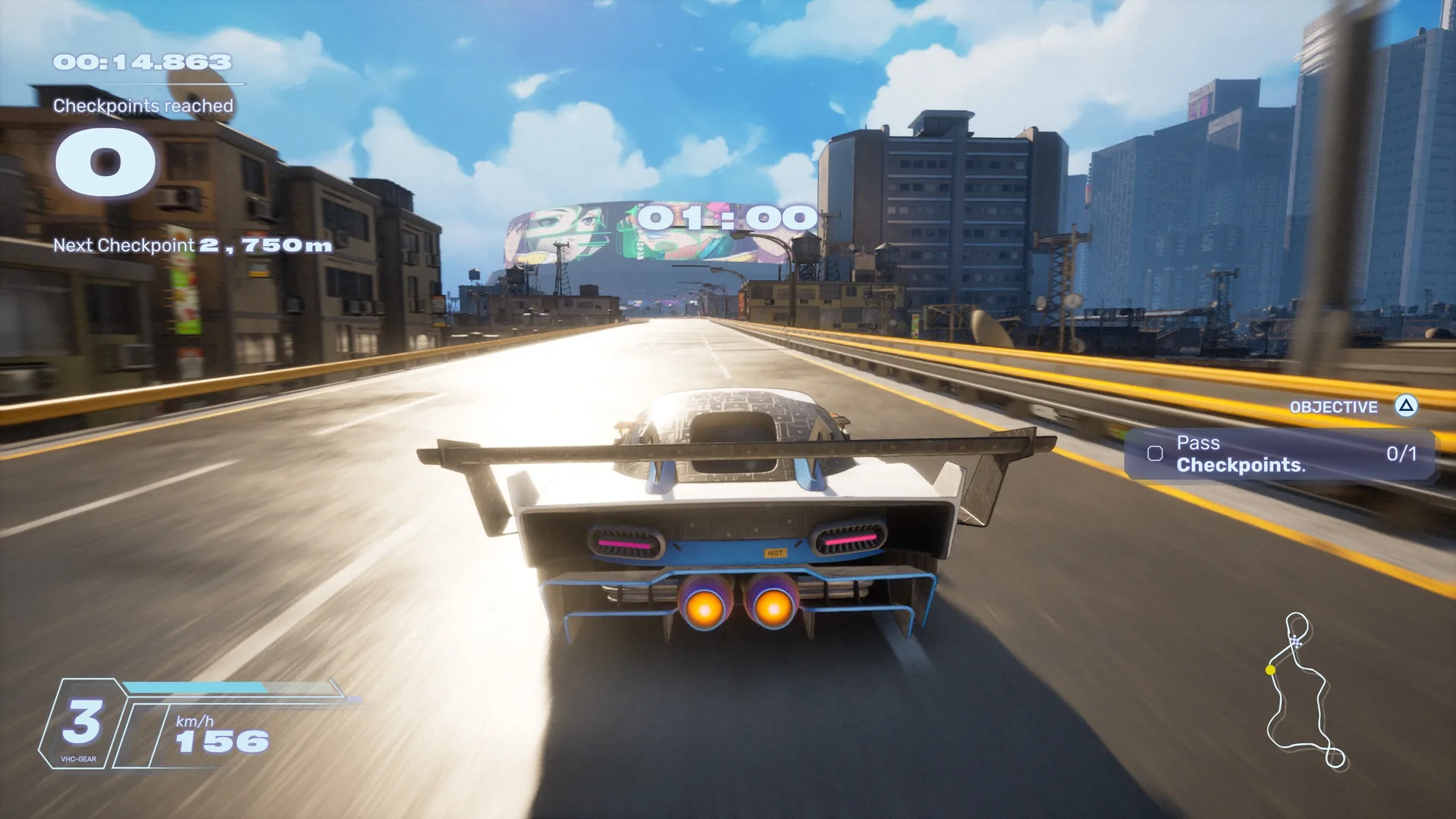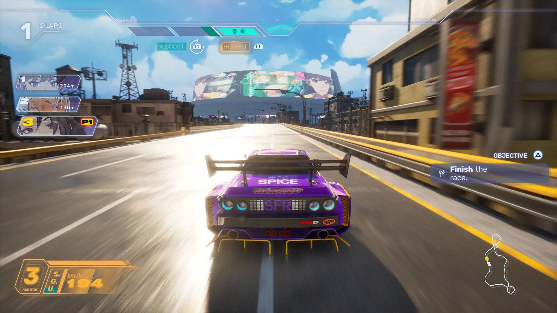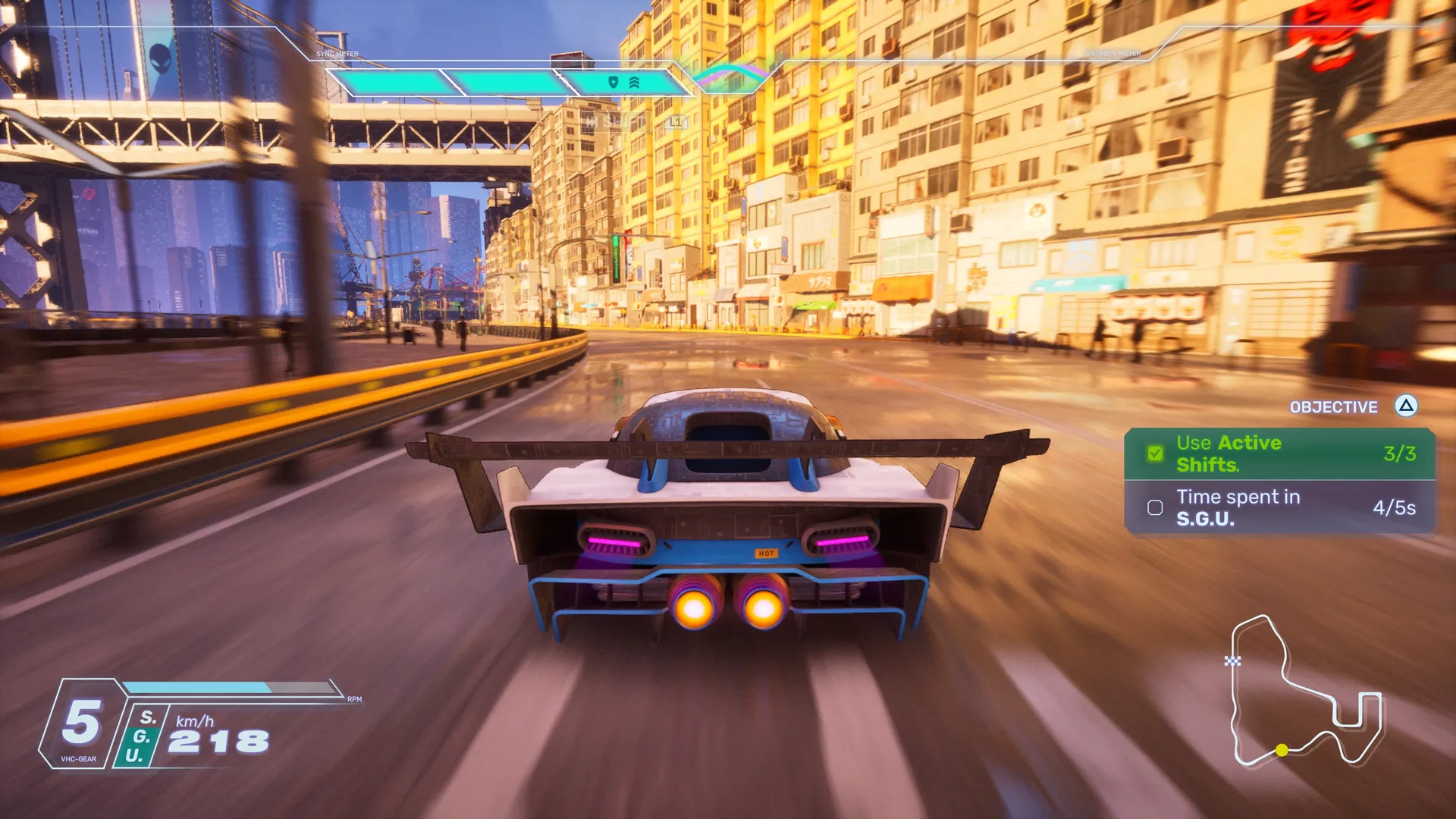 Hloubka mechanik pokračuje u ovládání. Levou páčkou tradičně zatáčíte, ale pravou v reálném čase aktivně korigujete úhel driftu a přilnavost pneumatik. Křivka učení je sice strmá a vyžaduje trpělivost, ale jakmile systém ovládnete, nabízí úroveň kontroly, o které se jiným arkádám ani nesní. Pocit, kdy v rychlosti 350 km/h milimetrově líznete apex zatáčky díky preciznímu vyrovnání driftu, je čistá herní katarze. Tratě jsou navrženy tak, aby toto ovládání plně využily – od utažených vlásenek po dlouhé táhlé oblouky na dálničních obchvatech města, kde se s pravou páčkou doslova pomazlíte. Zajímavý je i přístup k vizuální identitě vašeho vozu. Tuning je zde pojat ryze kosmeticky, což je osvěžující krok, který v kontextu hry skvěle funguje. Namísto nekonečného grindu za lepším motorem se soustředíte na plnění výzev, za které získáváte nové vizuální doplňky. Tento systém udržuje absolutní férovost na trati a dává jasně najevo, že o vítězi rozhoduje čistý skill. Své schopnosti pak můžete prověřit v plynulém multiplayeru, který k online režimům přidává i dnes už vzácný lokální splitscreen.