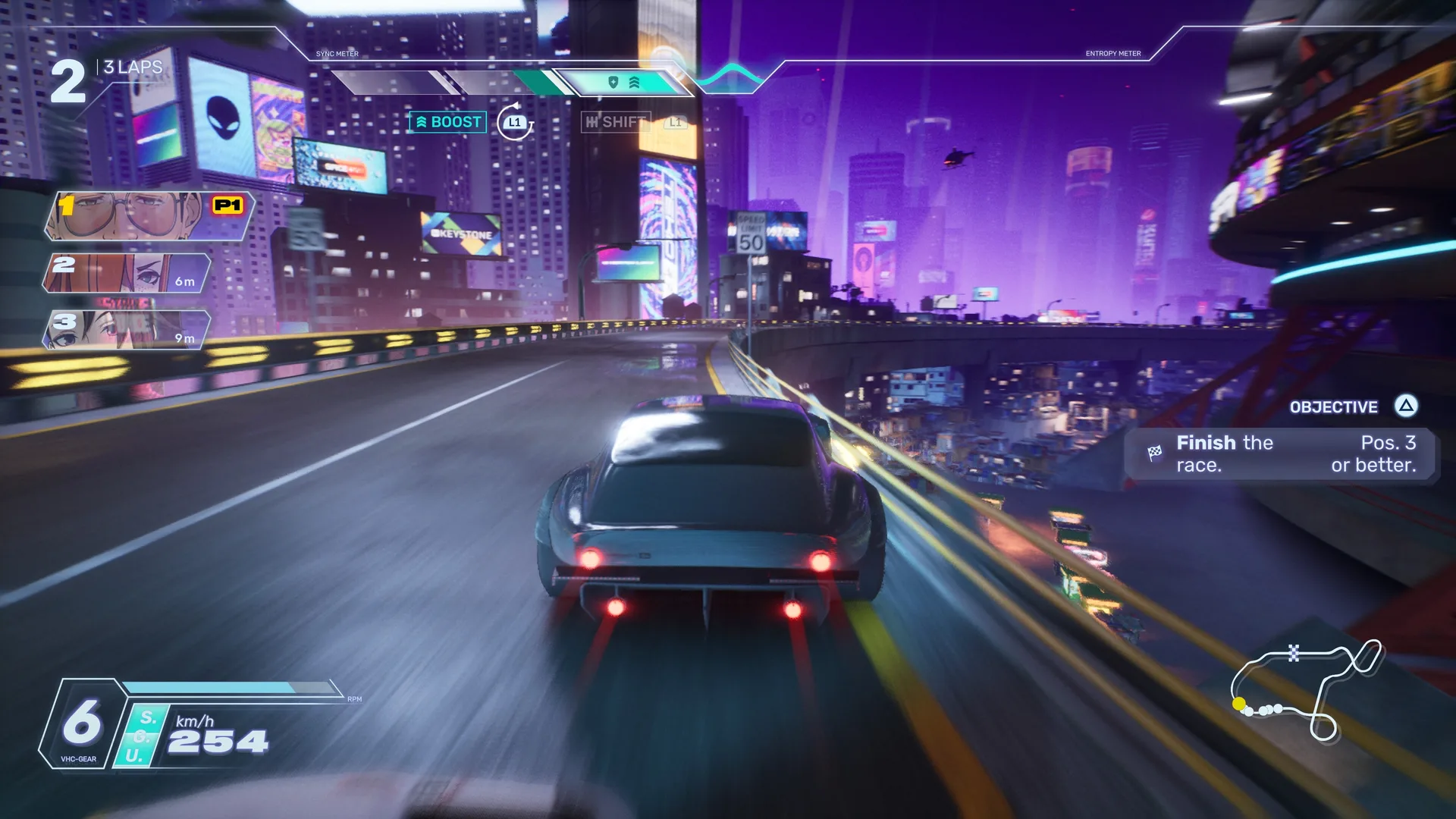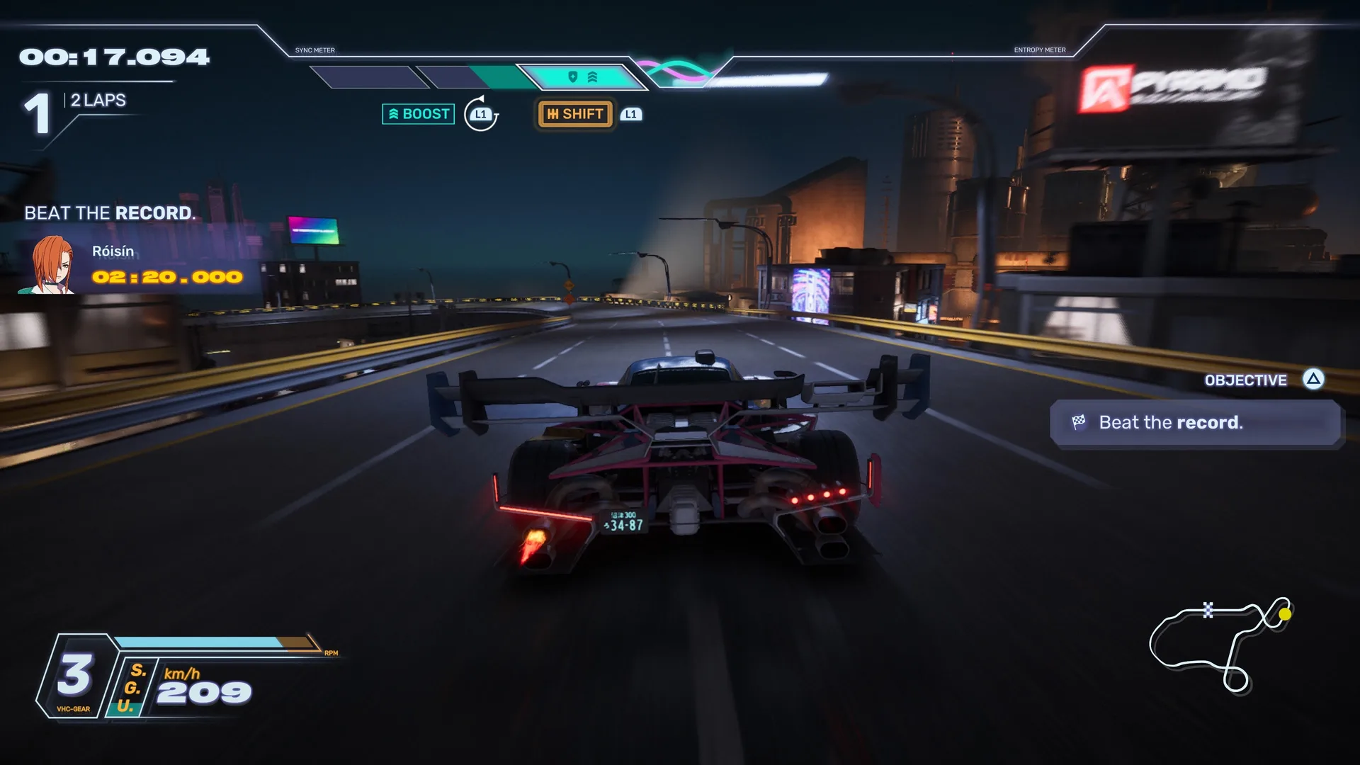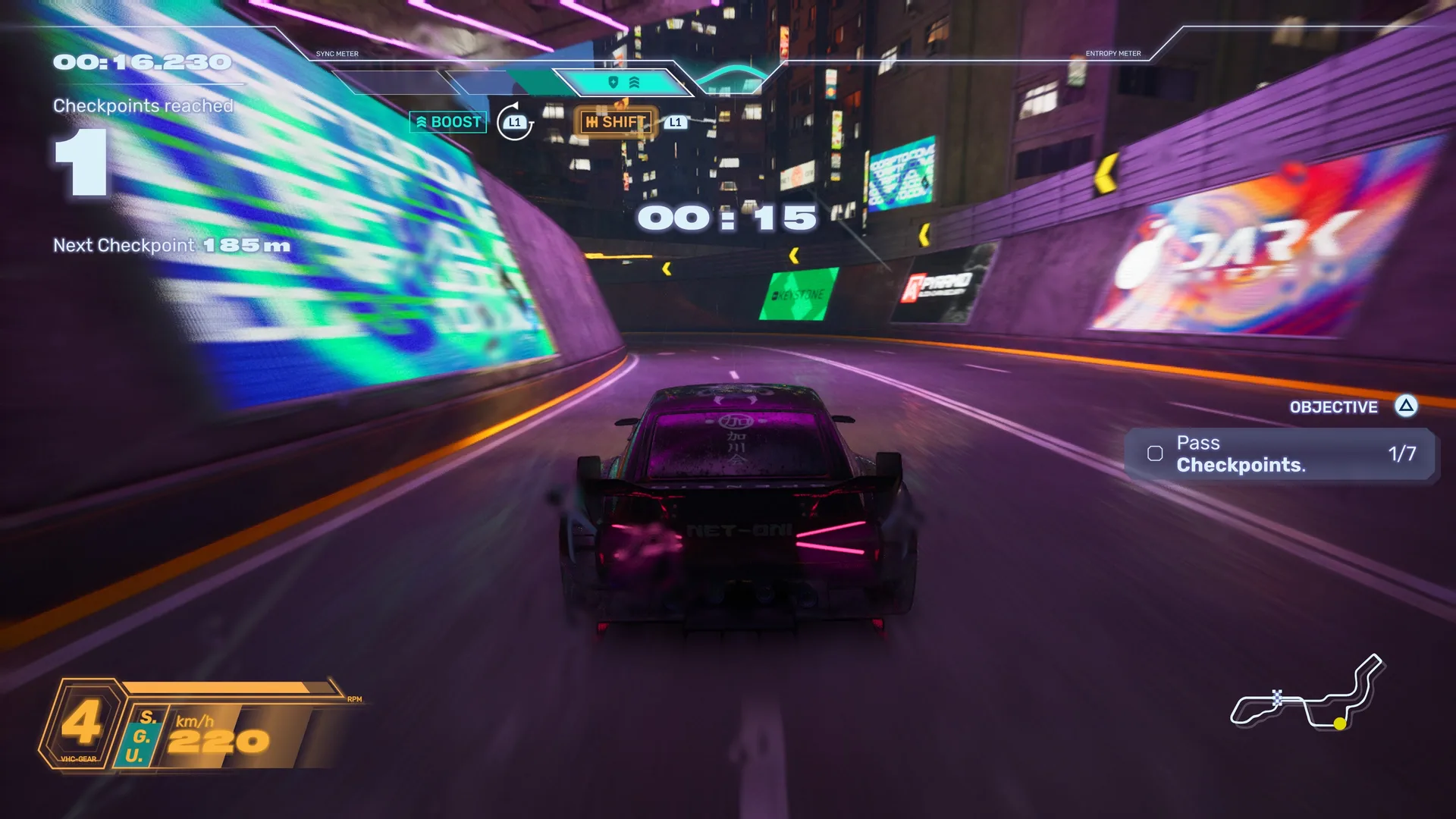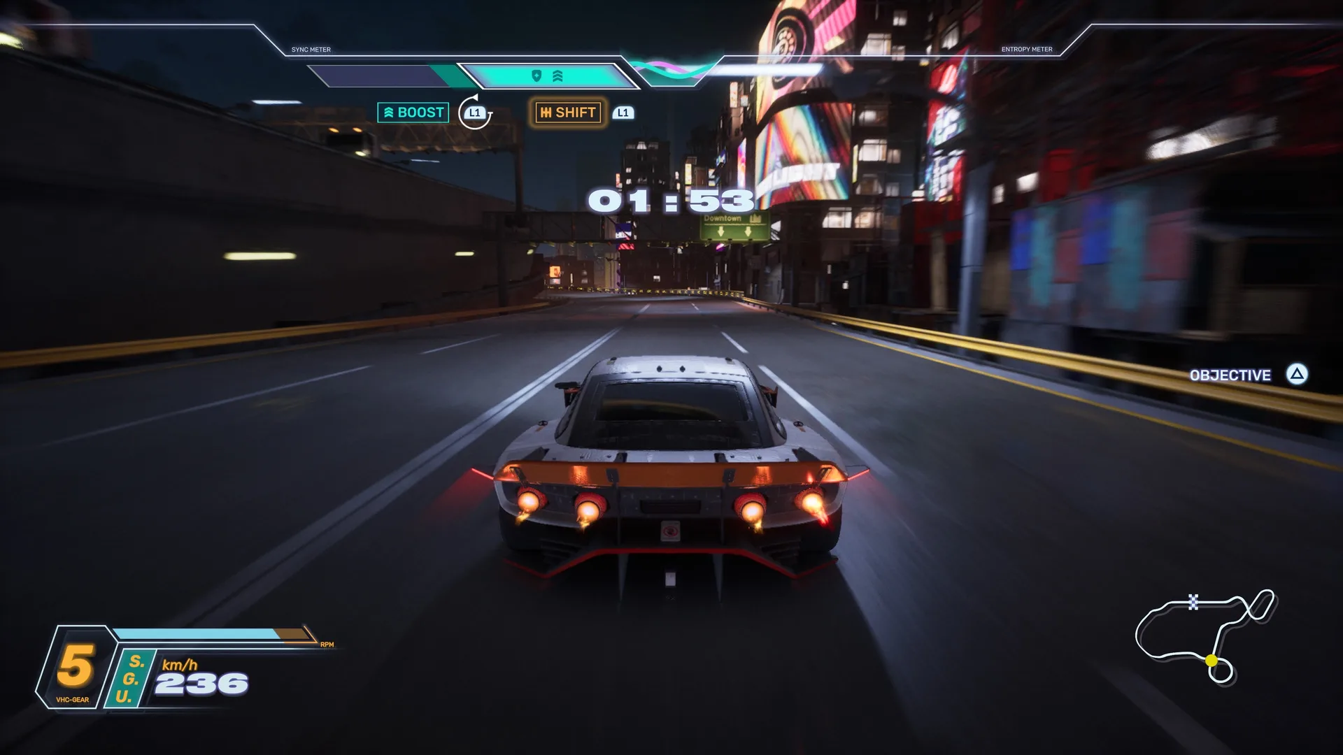 To, co titul vyvyšuje nad ostatní arkády, je unikátní správa energie v rámci systému ECHO. Celý systém stojí na symbióze dvou proudů, které musíte neustále vyvažovat, aby vaše jízda byla efektivní. Modrá energie Sync se buduje čistou jízdou, driftováním a mechanikou přesného přeřazení v ideálních otáčkách. Sync využíváte pro krátké boosty nebo aktivaci defenzivního štítu proti výpadům soupeřů. Používáním Syncu však jako vedlejší produkt generujete oranžovou energii Entropy, která je palivem pro čistou destrukci. Ta vám umožňuje provést manévr Strike, prudký boční náraz, který dokáže soupeře vyřadit z ideální stopy. Pro nejodvážnější je tu pak režim Overdrive, který obě energie kombinuje do brutálního výkonu a nezastavitelnosti, ovšem s fatální nevýhodou - v tomto stavu stačí sebemenší kontakt se svodidly a váš stroj okamžitě exploduje. Tento management zdrojů dodává každému závodu neuvěřitelné taktické napětí.