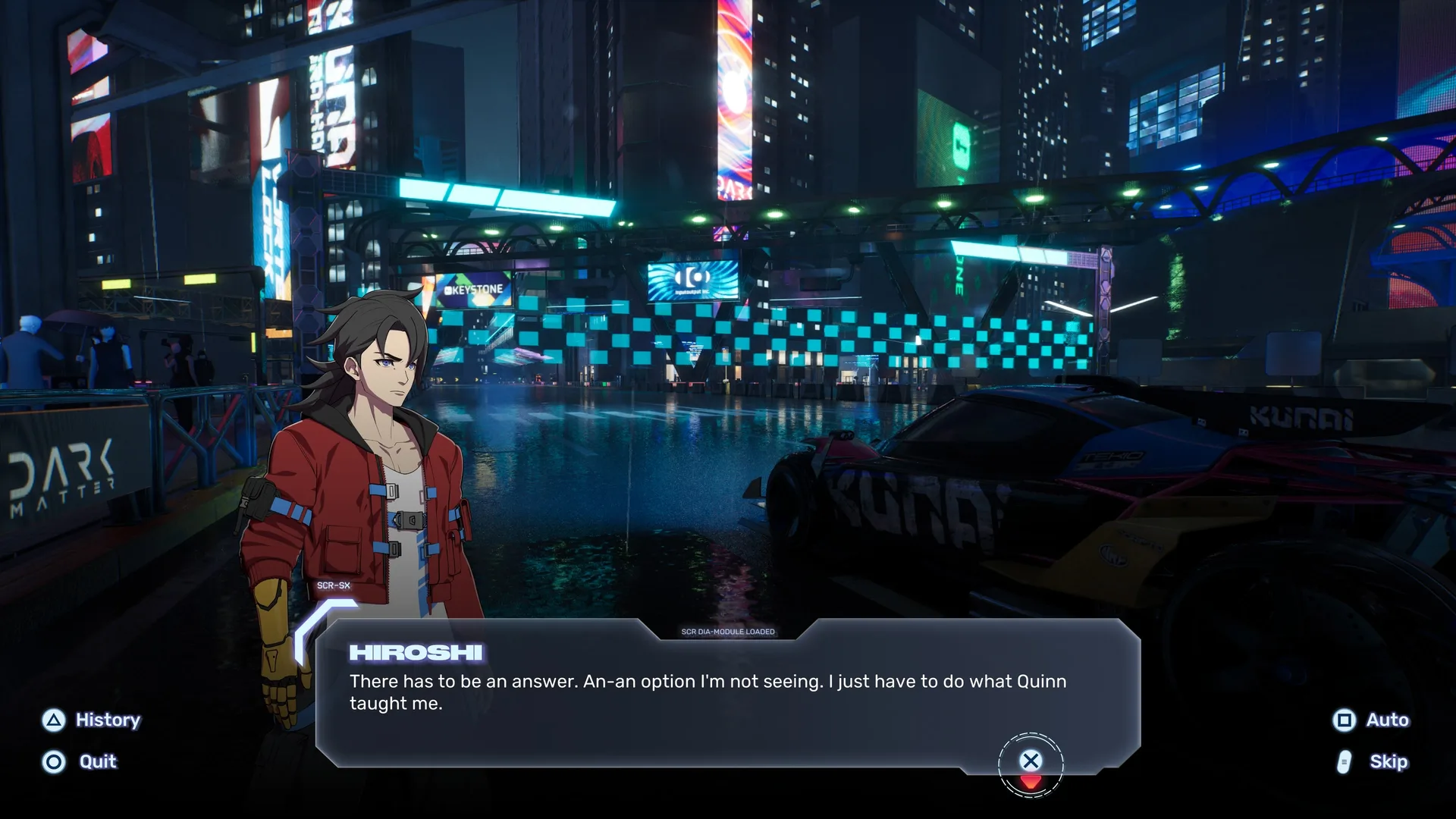Děj nás vrhá do blízké budoucnosti, do metropole Neo Rey, která je dějištěm ilegálního turnaje The Tournament. Screamer servíruje silný příběhový režim s cutscénami od studia Polygon Pictures. Příběh turnaje je protkán intrikami a tajemstvím, které sahá hluboko pod zářivý povrch neonových bulvárů. Celý narativ se točí kolem mocenského vakua v Neo Rey, kde vítěz turnaje nezíská jen peníze, ale i vliv nad technologiemi, které město ovládají. Hráč se ocitá uprostřed spiknutí, kde se hranice mezi ilegálními závody a korporátní špionáží nebezpečně stírají. Postupně odkrýváte, že turnaj není jen sportem pro znuděné elity, ale klíčovým bodem v globální hře o moc, přičemž každé vítězství vás posouvá blíž k pravdě, kterou se někdo v pozadí snaží za každou cenu umlčet. Celým tímto propletencem vás navíc provází záhadný a charismatický Mr. A, kterému propůjčil hlas fenomenální Troy Baker. Jeho ledově klidný projev dodává hlavnímu záporákovi hloubku, jakou v závodních hrách vidíme málokdy, a dělá z prostého kroužení na trati osobní souboj o holé přežití.