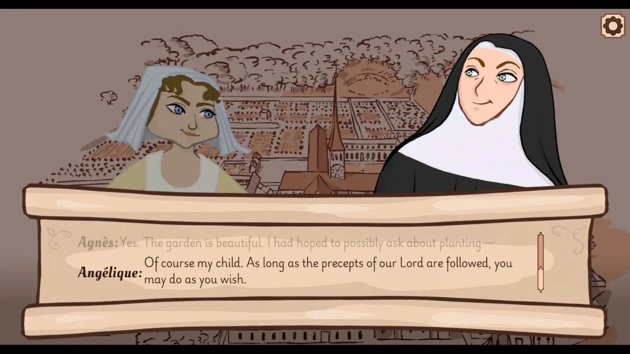 The Abbess Garden si nepotrpí na žádné okázalé úvody ani historické expozice a hodí vás rovnou do dění. Naštěstí se v mechanikách rychle zorientujete a kdo má navíc načtené nebo nakoukané Tři mušketýry, bude se v prostředí zdejšího kláštera orientovat o to snáz. Příběh se odehrává ve Francii 17. století, zhruba ve stejné době jako již zmíněný slavný román Alexandra Dumase, a sleduje v komorním měřítku vzestup a pletichy mocného kardinála Richelieua a jeho nohsledů. Hrajete za Agnés, mladou slečnu, která je místní abatyší na doporučení svého otce přijata jako zahradnice v místní klášterní zahradě. Rozjezd děje je velmi pozvolný a po prvních několika herních měsících jsem měl pocit, že se příběhově vlastně nic zásadního dít nebude. To se ale změní s příchodem kardinálových mušketýrů - do hry vstupují problémy, spiknutí, důležitý deník, po kterém baží snad polovina Evropy i širší okruh postav, které vás budou provázet ve chvílích, kdy zrovna hlavní hrdinka Agnés nedrží v ruce konev s vodou.