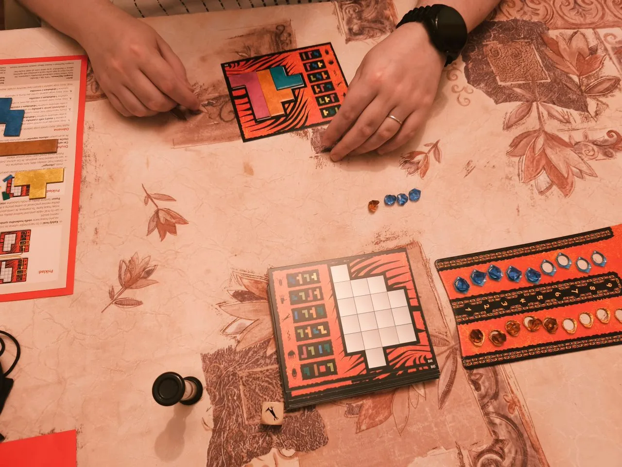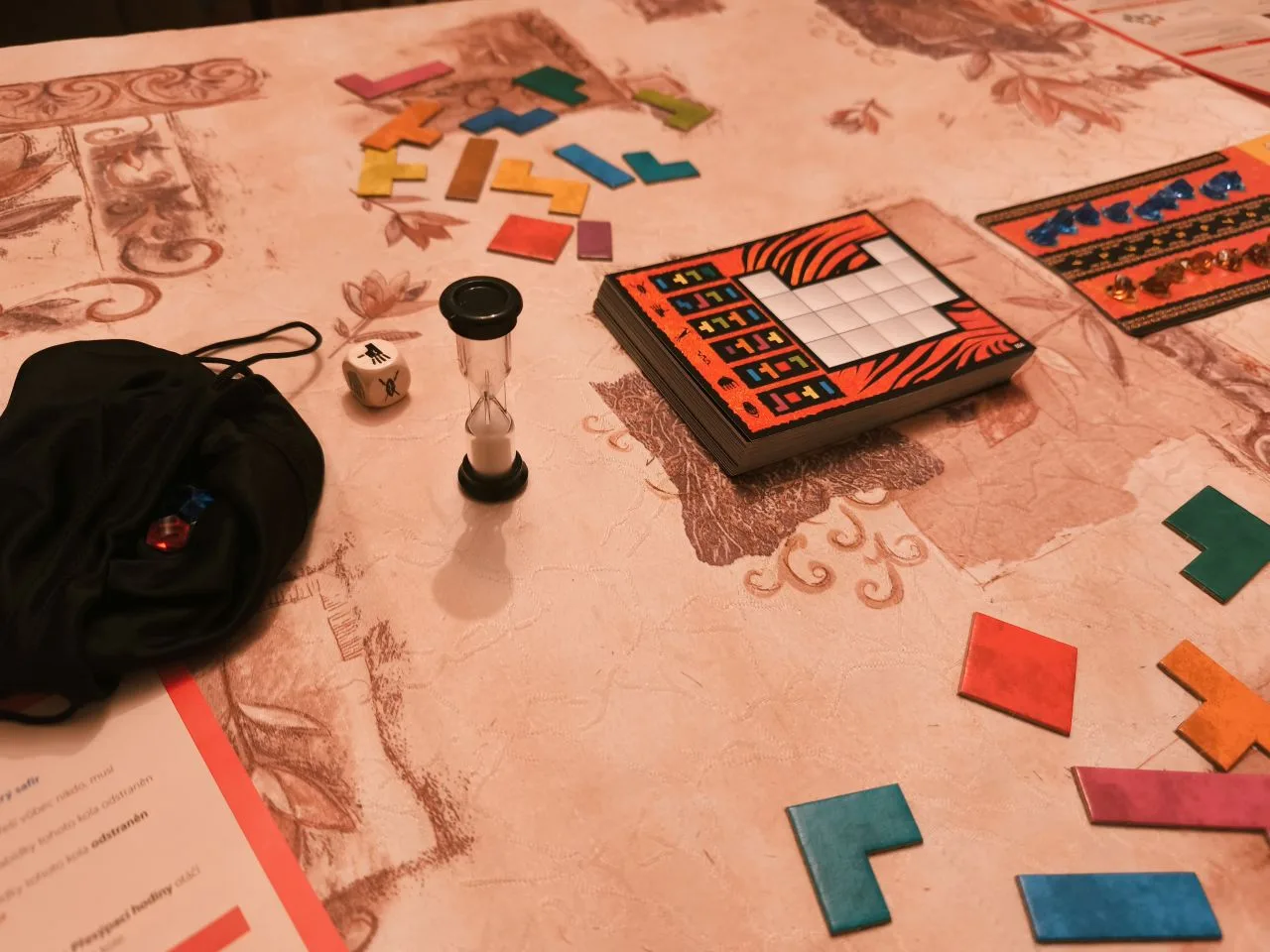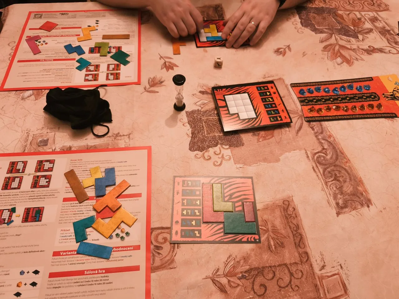 Než sa do hry pustíte, vyberiete si náročnosť. Pri tej ľahšej umiestňujete na kartu 3 rôzne dieliky, v prípade náročnejšieho variantu 4 dieliky. Dieliky môžete ľubovoľne otáčať, no musíte zaplniť všetky biele štvorčeky na karte. Každá karta obsahuje na každej svojej strane 6 hlavolamov. Pýtate sa, či musíte splniť všetky? Nie, nemusíte, kocka vám v každom kole určí symbol hlavolamu, ktorý budete aktuálne plniť. Každý hráč dostane kartu s hlavolamom, následne jeden z hráčov hodí kockou a ďalší otočí hodiny. Čas tak beží a vy nesmiete zaváhať, keďže potrebujete predbehnúť súperov, no zároveň počítajte s tým, že čas môže byť rovnako neúprosný ako vaši súperi a nakoniec v danom kole možno aj nikto včas nevyhrá. Komu sa však hlavolam podarí vyriešiť, ten si môže z vrecúška vytiahnuť náhodný drahokam.
