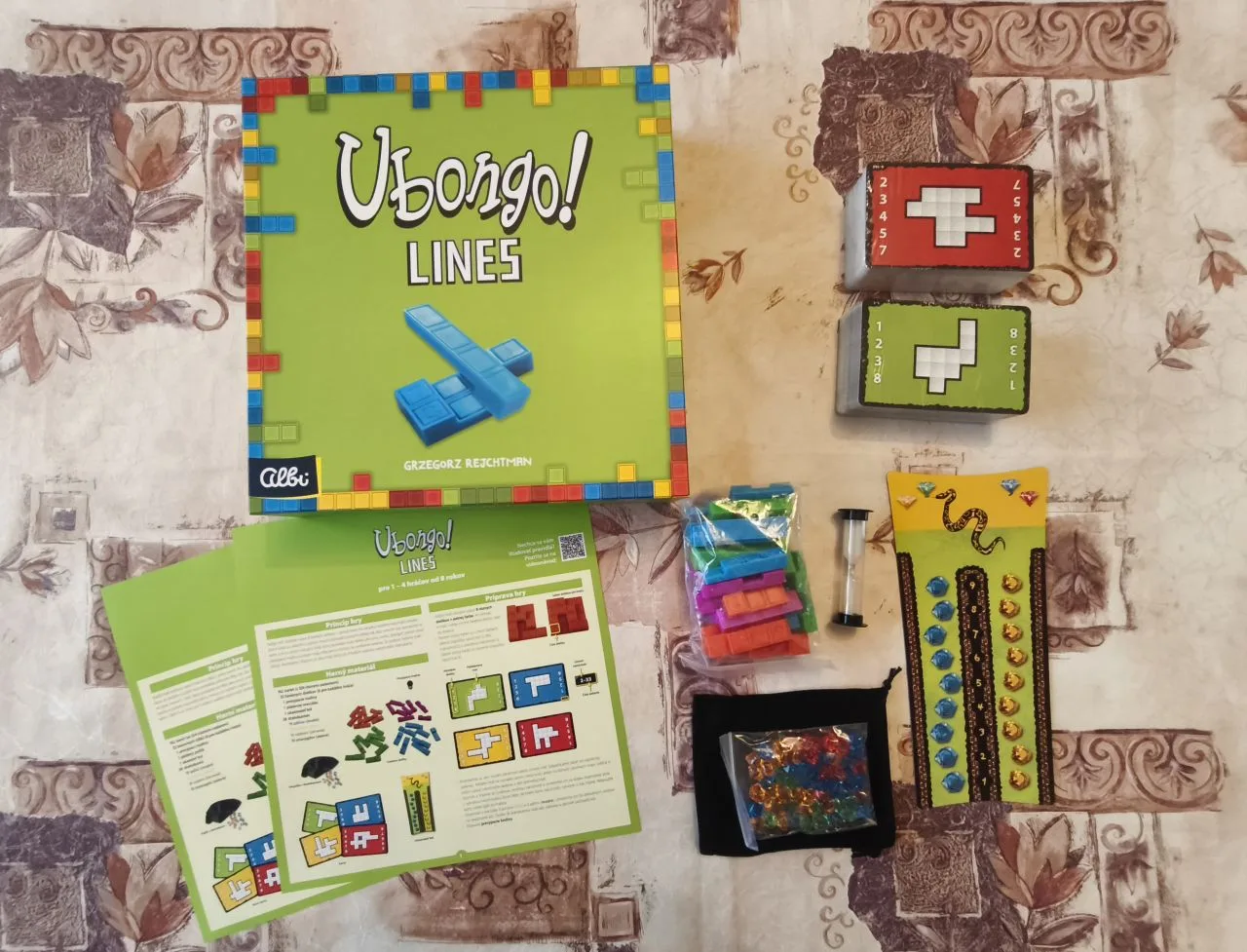 Herné komponenty Lines sú dosť podobné ako v prípade originálneho Ubongo!. Opäť tak dostanete 2 stránky s pravidlami: v češtine aj slovenčine. Čaká vás plátenné vrecúško s drahokamami v 4 farbách, pričom farby charakterizujú počet bodov. Už tradične dostávate aj kartónový ukazovateľ kôl, na ktorý zároveň umiestňujete jantárové a zafírové drahokamy za úspešné splnenie hlavolamov. Ubongo! by sa, samozrejme, nezaobišlo bez presýpacích hodín, takže tie máte k dispozícii taktiež. Najväčšou zmenou prešli karty s hlavolamami a jednotlivé dieliky pre hráčov. Karty s hlavolamami obsahujú 4 náročnosti zadefinované farbami. Nakoniec nám ostali herné dieliky. Tých každý hráč dostane 8, pričom všetky sú navzájom odlišné. Okrem toho sú tentokrát jednofarebné a každý dielik je označený svojím poradovým číslom. Zároveň každý hráč obdrží sadu dielikov v odlišnej farbe. Koncept hry takto ostáva výrazne podobný tomu originálnemu.