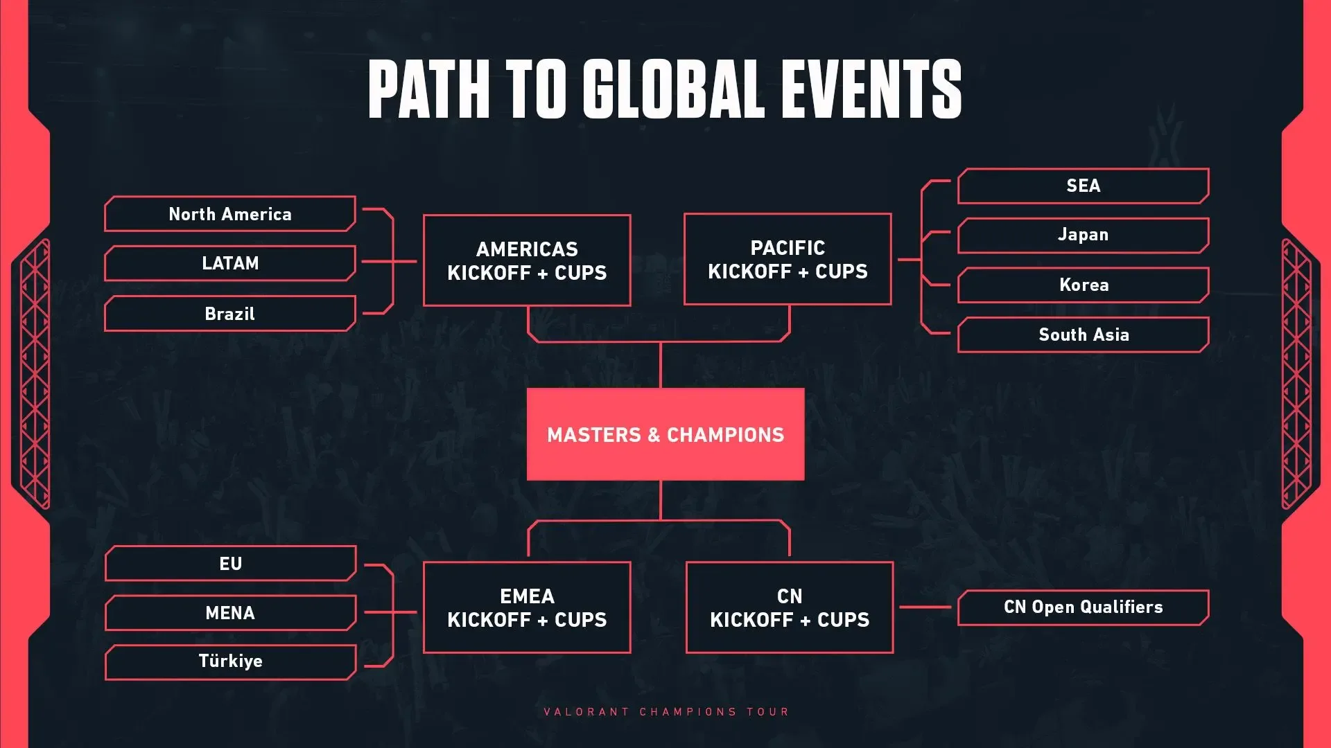 Z pohľadu štruktúry regiónov sa veľa nemení. Naďalej budú existovať štyri hlavné ligy: VCT EMEA, VCT Americas, VCT Pacific a VCT China. Rozdiel je však v tom, ako sa do nich tímy dostanú a ako budú prebiehať samotné kvalifikácie.