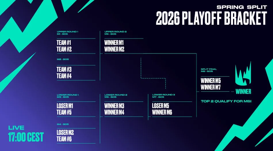 Playoff začne 23. mája a vyvrcholí finálovým víkendom 6. až 7. júna, pričom počas splitu sa liga presunie aj mimo Berlína, konkrétne do Évry-Courcouronnes vo Francúzsku (24.–26. apríla), kde event hostuje Karmine Corp spolu s tímami ako Shifters, Natus Vincere a Fnatic, a následne do Madridu v Španielsku (8.–10. mája), kde hostiteľom bude Movistar KOI spolu s G2 Esports, Karmine Corp a GIANTX.