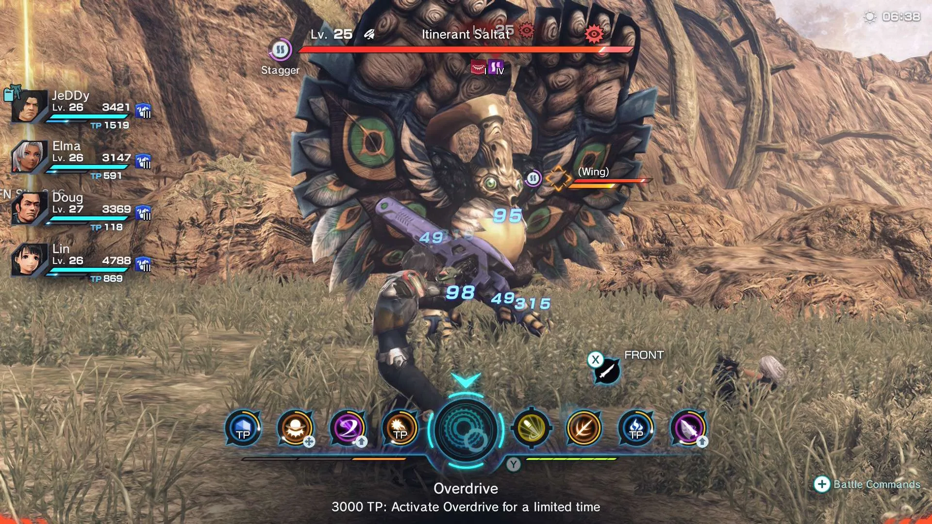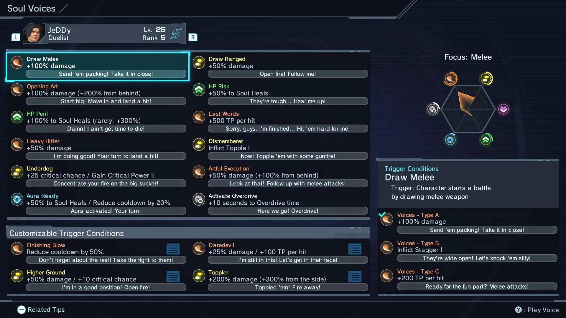 Dalším aspektem, ve které hra vyniká, je její soubojový systém. Ten byl z velké části přebrán z prvního Xenobladu. Ve zkratce: máte dvě různé zbraně, jednu na dálku a jednu na blízko, a až osm sdílených schopností. Schopnosti se podle barvy dělí na: oranžové (útoky na blízko), žluté (útoky na dálku), zelené (léčení), modré (buffy) a fialové (debuffy). Při samotném boji se pak všechno děje v reálném čase, společníci bojují o sto šest, postava vám automaticky útočí a vy ručně vybíráte, kterou schopnost použijete. Kdokoliv pak může svými schopnostmi aplikovat na nepřátele negativní statusy, na které lze navázat reakcí od parťáka. V takovém případě postava na ostatní zavolá, jaký typ schopnosti by se měl použít, a při jejím využití získáte bonus. Ve hře se jim říká Soul Voices a vy si dokonce můžete nastavovat, jaký bonus získáte na kterou reakci.