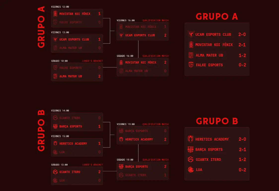 UCAM Esports dokázali v těsné sérii přehrát Movistar KOI, zatímco Heretics Academy si poradili s Barçou. Spodní pavouk přinesl krátké vzepětí pro Alma Mater UB a GIANTX iTero, jejichž cesta ale skončila v rozhodujících duelech o semifinále.