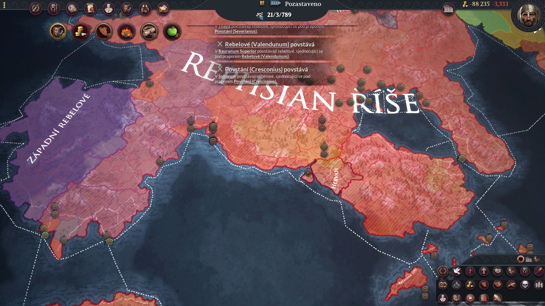 První skutečný otřes dorazí už během úvodní půlhodiny Velké kampaně. Nečeká se na desátou hodinu, na pozdní fázi hry, kdy už má hráč pocit kontroly. Stabilita se propadá, ekonomika zadrhává, periferie se osamostatňují. Co působilo jako pevný celek, se začne rozpadat na jednotlivé problémy. Najednou není čas plánovat ideální scénář. Není čas budovat dlouhodobé strategie bez rizika. Je třeba reagovat. Rychle. Instinktivně. S vědomím, že každý krok otevře další slabinu.