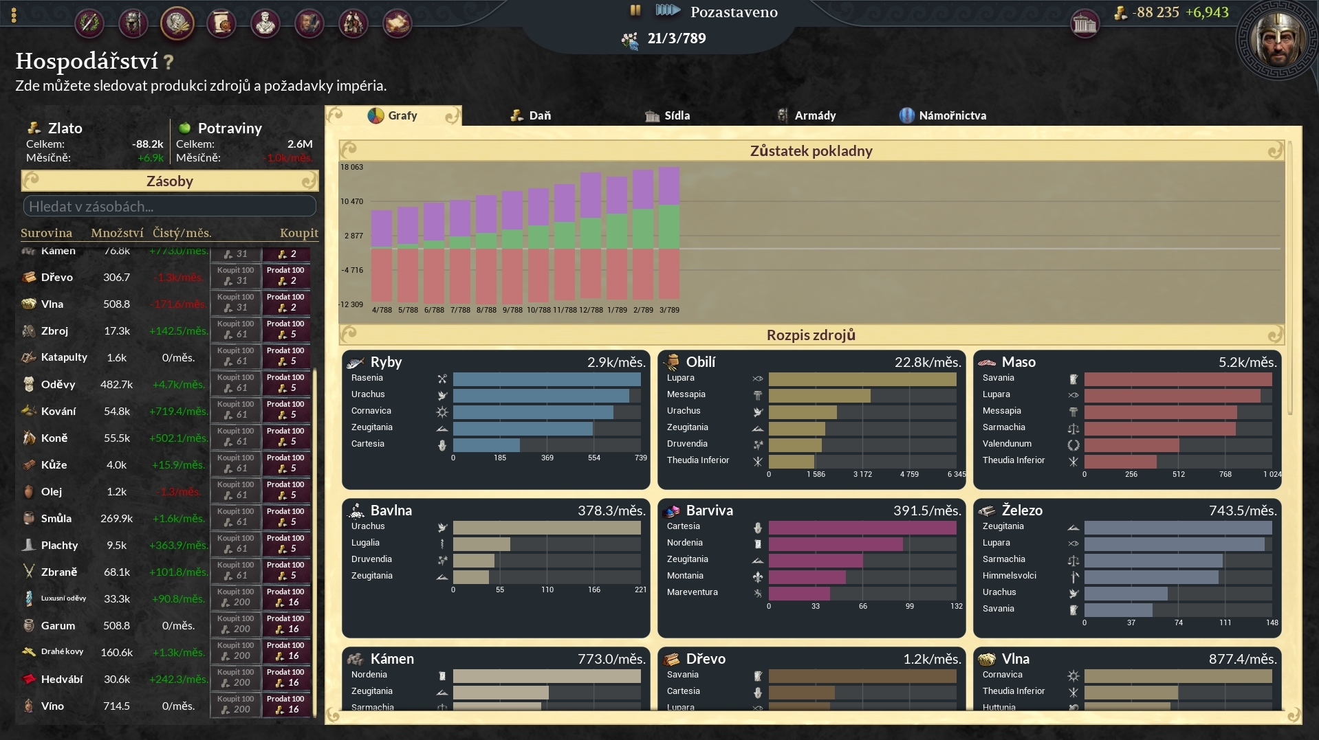 Nejsilnější moment přichází ve chvíli, kdy je jasné, že všechno zachránit nepůjde. Města generují finance, ale potřebují ochranu. Komodity – od luxusního zboží po základní potraviny – drží společnost pohromadě. Luxus uklidňuje elity. Jídlo drží obyvatelstvo. Další suroviny podporují armádu a infrastrukturu. Každá z nich má konkrétní dopad na stabilitu, armádu i ekonomiku.